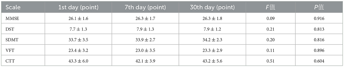 A total of 56 elderly healthy persons were enrolled in community hospitals. There were no significant differences in MMSE, DST, SDMT, VFT or CTT scores among the three neuropsychological combination scale assessments at 7 d or 30 d intervals (P > 0.05) (Table 3).