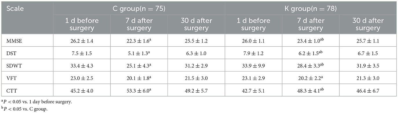 The MMSE, DST, SDMT and VFT scores were lower at 7 days after surgery than at 1 day before surgery, and the CTT scores were greater (P < 0.05). There was no significant difference in scale scores at 1 day before surgery between the two groups and the community patient group (P > 0.05). The MMSE, DST and SDMT scores in group K at 7 days after surgery were greater than those in group C, and the CTT score decreased (P < 0.05) (Table 4).