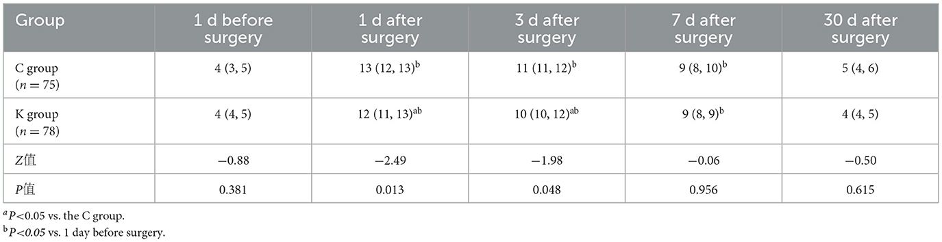 The PSQI scores of the two groups were greater at 1 day, 3 days and 7 days after surgery than at 1 day before surgery (P < 0.05). The PSQI scores were lower in the K group than in the C group at 1 day and 3 days after surgery (P < 0.05) (Table 5).