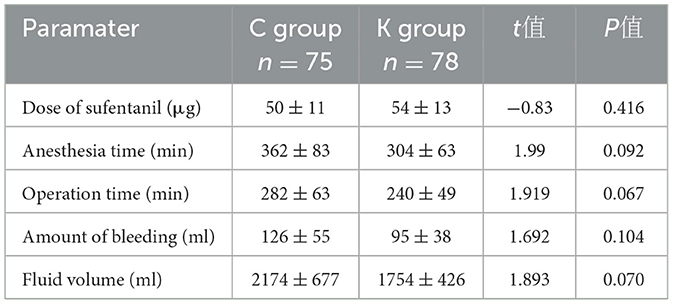 There were no significant differences in the dose of sufentanil, anesthesia time, operation time, blood loss or infusion volume between the two groups (P > 0.05) (Table 6).
