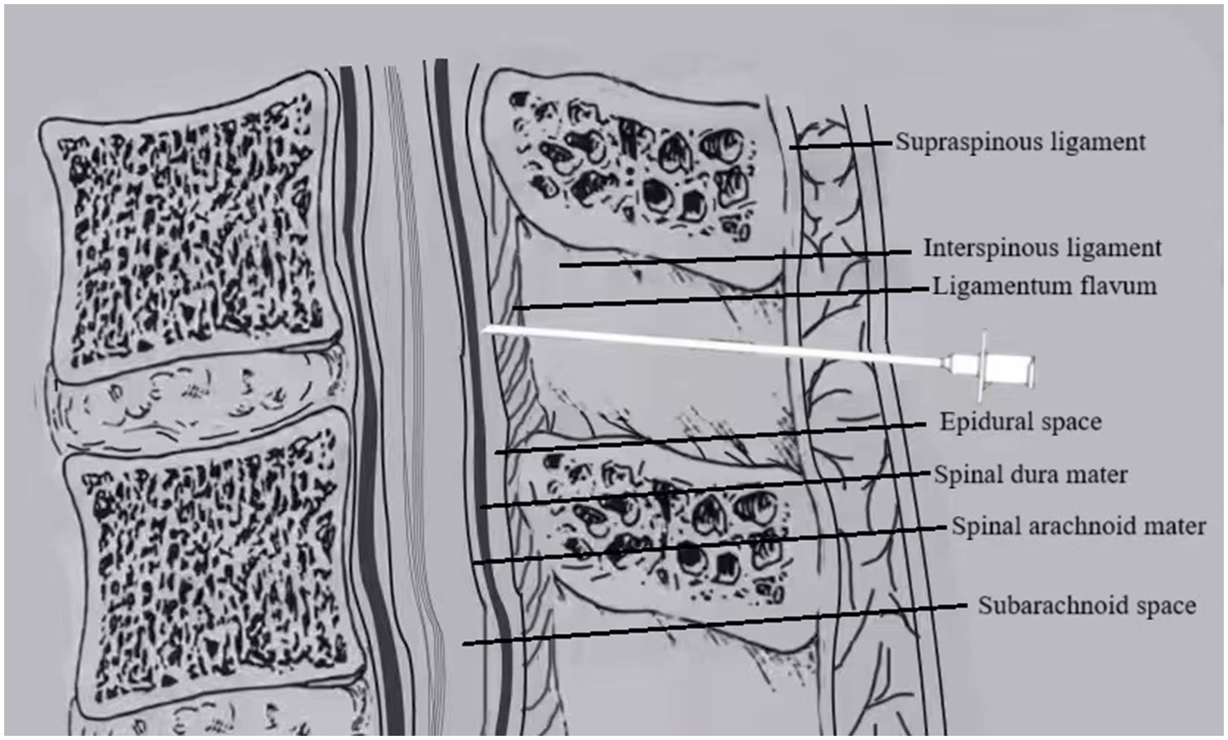 Group D (DPE–PIEB): After successful epidural puncture, the epidural catheter was temporarily withheld. A 25G Whitacre puncture needle was inserted through the Tuohy needle to puncture the dura mater. Once smooth CSF return was confirmed, the Whitacre needle was withdrawn. The epidural catheter was then advanced cephalad into the epidural cavity by 3–4 cm and securely fixed after ensuring that no CSF or blood was present upon aspiration, as shown in Figure 2.