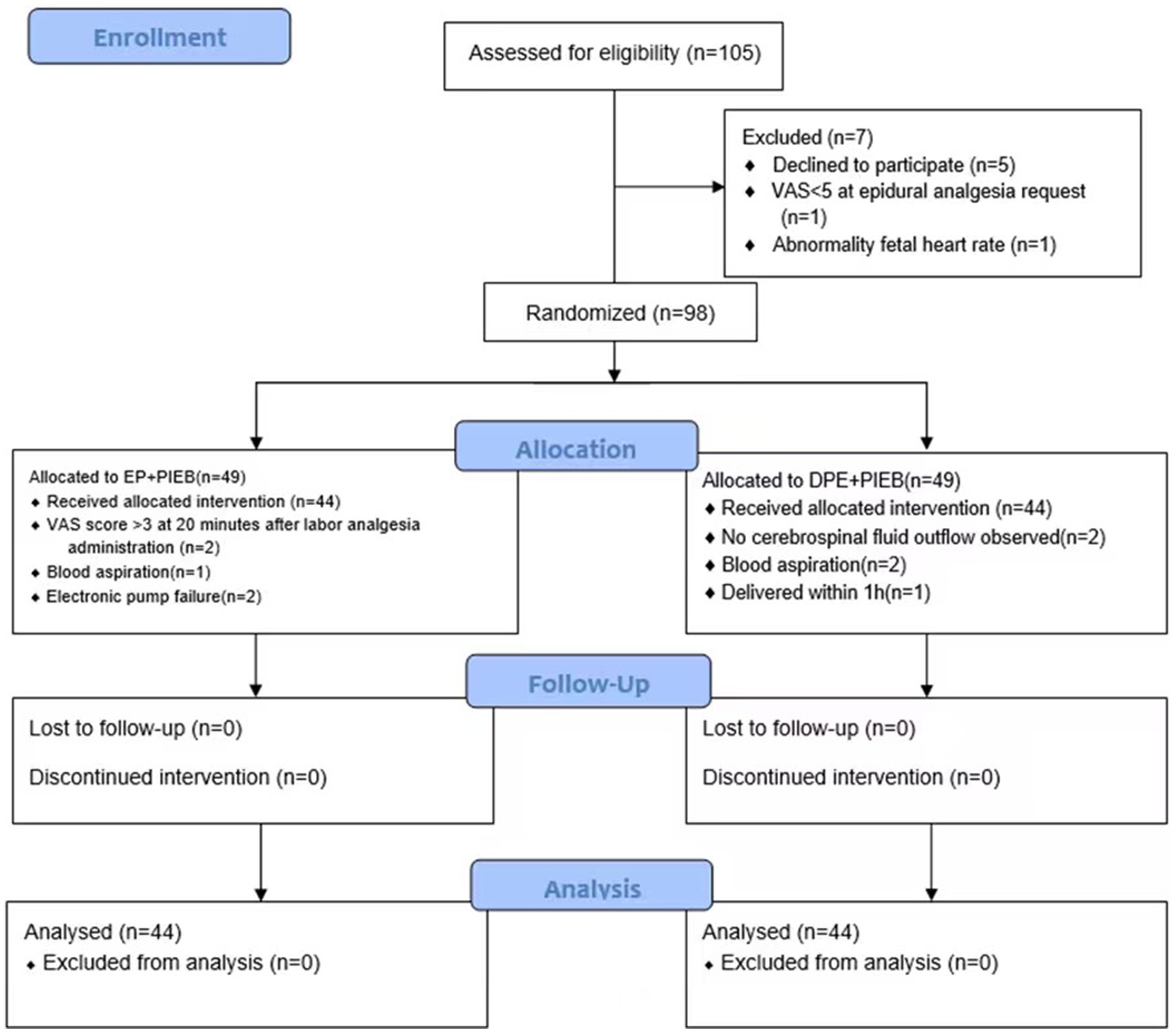 Using computer-generated randomization (Stata Statistical Software, Release V.14, StataCorp), patients were consecutively randomized and assigned to either the DPE–PIEB group (Group D, n = 49) or the EP–PIEB group (Group E, n = 49). Allocation numbers were sealed in envelopes corresponding to the serial number of each study. These envelopes were opened by the anesthesiologist immediately before the administration of labor analgesia, thus, only the performing anesthesiologist was aware of the group assignment. Patients were not informed of their specific group allocation. Outcome assessments were performed by a research assistant who was blinded to group allocation and was not involved in the administration of anesthesia. In addition, the obstetrician and midwives in charge of the patients were also blinded to group assignments. The integrity of the envelopes was regularly monitored by the researchers, and access to the randomization table was prohibited until the end of the study.