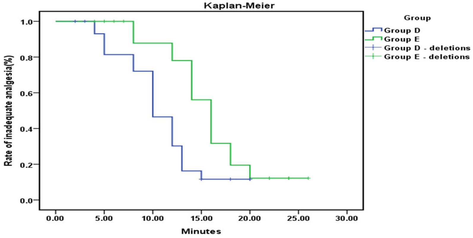 Figure 4. Kaplan–Meier analysis showed a significantly shorter time to effective analgesia from the loading dose in Group D compared to Group E (p < 0.001).