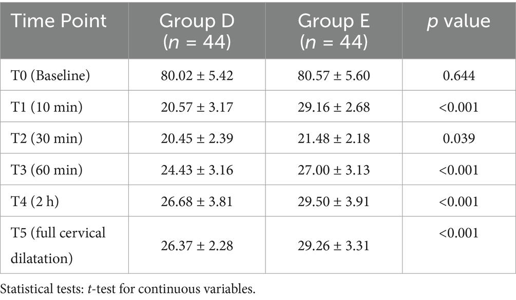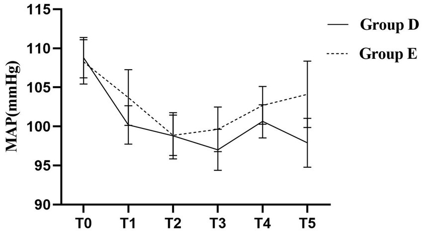 The pattern of MAP change over time was significantly different between the two groups as assessed by repeated measures ANOVA (group-by-time interaction, p < 0.05). No instances of systolic blood pressure exceeding 20% of the baseline were observed in either of the groups. While MAP decreased to some extent in both groups after the implementation of labor analgesia, post-hoc analysis revealed that patients in Group E had significantly higher MAP values at time points T1, T3, T4, and T5 compared to Group D, and the difference was statistically significant (p < 0.05; Table 2). The hemodynamic profiles of both groups across all time points are visually represented in Figure 5. Specifically, MAP was 100.20 ± 2.47 mmHg in Group D and 103.70 ± 3.56 mmHg in Group E at the T1 time point; this trend persisted at the T3, T4, and T5 time points: T3 (97.00 ± 2.64 vs. 99.64 ± 2.85 mmHg); T4 (100.66 ± 2.13 vs. 102.70 ± 2.41 mmHg); T5 (97.90 ± 3.13 vs. 104.12 ± 4.25 mmHg).