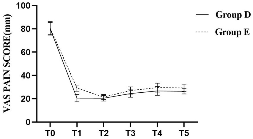 The VAS scores for both groups at all predefined time points are summarized in Table 3. Compared to Group E, patients in Group D had significantly lower VAS scores at time points T1, T3, T4, and T5 (p < 0.05), indicating more effective pain control. No statistically significant differences were observed at the other time points (p > 0.05), as shown in Figure 6.