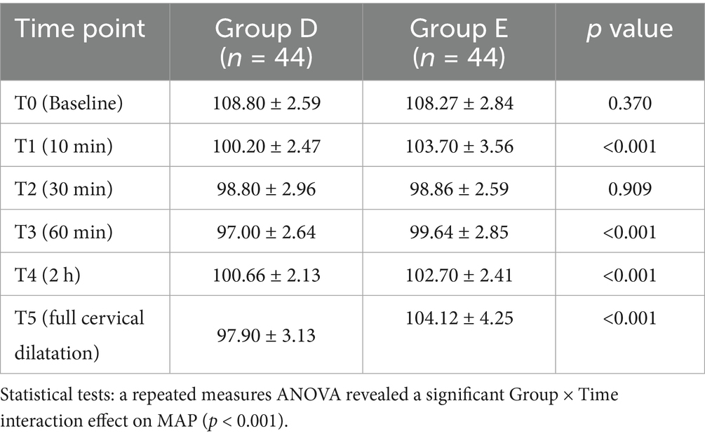 Figure 5. Trajectories of Mean Arterial Pressure (MAP) during labor in the two groups. A repeated-measures ANOVA revealed a significant Time × Group interaction effect (p < 0.05), indicating that the pattern of MAP change differed significantly between the two groups. The Group D demonstrated a lower and more stable hemodynamic profile.