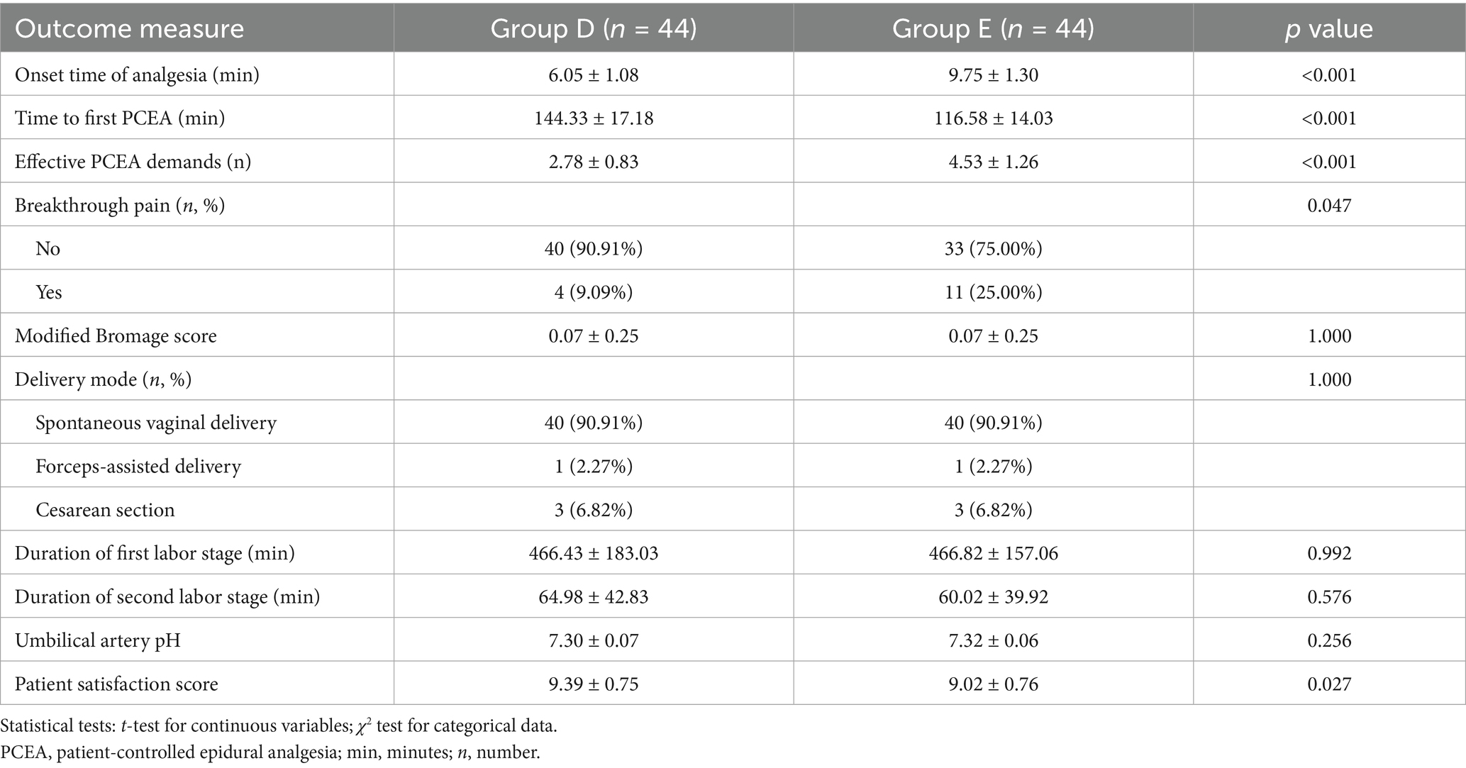 Although neuraxial analgesia is the gold standard for labor analgesia (4, 5), the traditional epidural (EP) block has the disadvantages of slow onset of action and a high incidence of analgesic insufficiency (6, 7), which leads to catecholamine surge and hemodynamic fluctuations, thus increasing perinatal risk. Studies have shown that the dural puncture epidural (DPE) block can rapidly achieve analgesia by puncturing the dura mater and allowing the local anesthetic to diffuse directly into the subarachnoid space. Compared with EP, DPE has been shown to reduce the time to onset of analgesia and improve the completeness of the block (8–10). However, when combined with traditional continuous epidural infusion (CEI), DPE may still result in breakthrough pain and local anesthetic accumulation. In recent years, programmed intermittent epidural bolus (PIEB) has been increasingly used in labor analgesia. Compared to CEI, PIEB delivers the anesthetic in pulsatile doses, which helps maintain more stable analgesia, reduces the incidence of breakthrough pain and motor block, and reduces the overall consumption of local anesthetic (11, 12). Preliminary evidence suggests that the combination of DPE and PIEB may enhance the quality of labor analgesia (13).