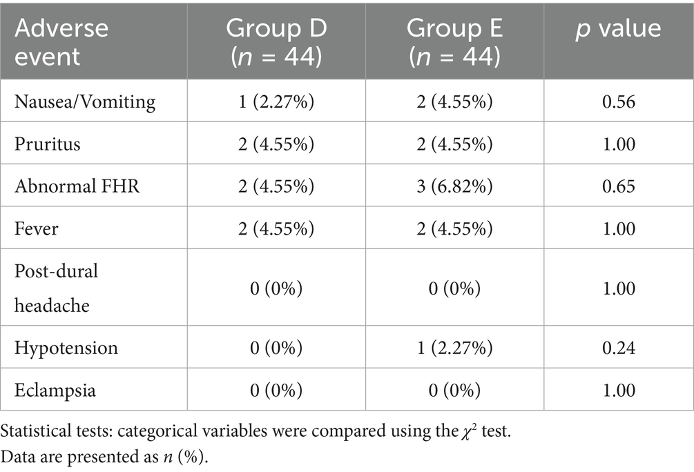 There was no significant difference in the occurrence of adverse events between the two groups (p > 0.05). One patient in Group E experienced transient hypotension, which was effectively managed with positional adjustment and rehydration. No significant differences in FHR abnormalities were observed between groups (p > 0.05). All cases resolved spontaneously or with positional adjustment, with no emergent deliveries required. No cases of headache or eclampsia after epidural puncture were reported in either group (Table 5).