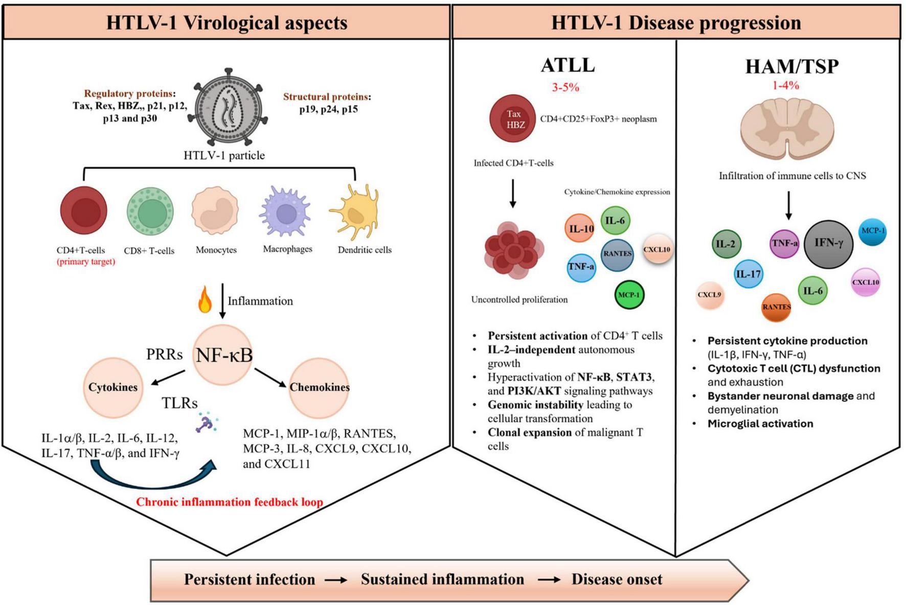 Schematic representation of HTLV-1 virological aspects and disease progression. (Left side) HTLV-1 infects multiple immune cell types, primarily CD41 T cells, but also CDS1 T cells, monocytes, macrophages, and dendritic cells. Viral proteins (regulatory: Tax, Rex, HBZ, p21, pl2, p13, p30; structural: pl9, p24, p15) activate pattern recognition receptors (PRRs) and toll-like receptors (TLRs), leading to NF-xB-mediated production of pro-inflammatory cytokines and chemokines, establishing a chronic inflammation feedback loop. (Right side) Disease outcomes include adult T-cell leukemia/lymphoma (ATLL, 3%–5% of infected individuals) characterized by uncontrolled CD4+ T-cell proliferation, persistent activation of NF-KB, STAT3, and PT3K/AKT pathways, and clonal expansion; and HTLV-1- associated myelopathy/tropical spastic paraparesis (HAM/TSP, 1%–4% of infected individuals) involving central nervous system (CNS) infiltration, persistent cytokine production, CTL dysfunction, and neuronal damage. ATLL, adult T-cell leukemia/lymphoma; CNS, central nervous system; CTL, cytotoxic T lymphocyte; CXCL, C-X-C motif chemokine ligand; HBZ, HTLV-1 basic leucine zipper factor; HAM/TSP, HTLV-1-associated myelopathy/tropical spastic paraparesis; IITLV-l, human T-cell leukemia virus type 1; IFN, interferon; IL, interleukin; MCP, monocyte chemoattractant protein; M1P, macrophage inflammatory protein; NF-kB, nuclear factor kappa-light-chain-enhancer of activated B cells; PI3K/AKT, phosphoinositide 3-kinase/protein kinase B pathway; PRRs, pattern recognition receptors; RANTES, regulated upon activation, normal T cell expressed and secreted; STAT3, signal transducer and activator of transcription 3; TLRs, toll-like receptors; TNF-a, tumor necrosis factor alpha.