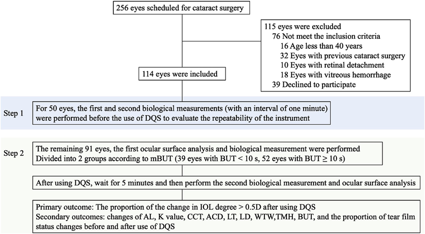 Figure 1. Study flowchart and procedures. DQS, diquafosol ophthalmic solution; AL, axial length; K, keratometry; ACD, anterior chamber depth; LT, lens thickness; LD, lens degree; CCT, central corneal thickness; WTW, white to white distance; TMH, tear meniscus height; mBUT, mean tear break-up time.