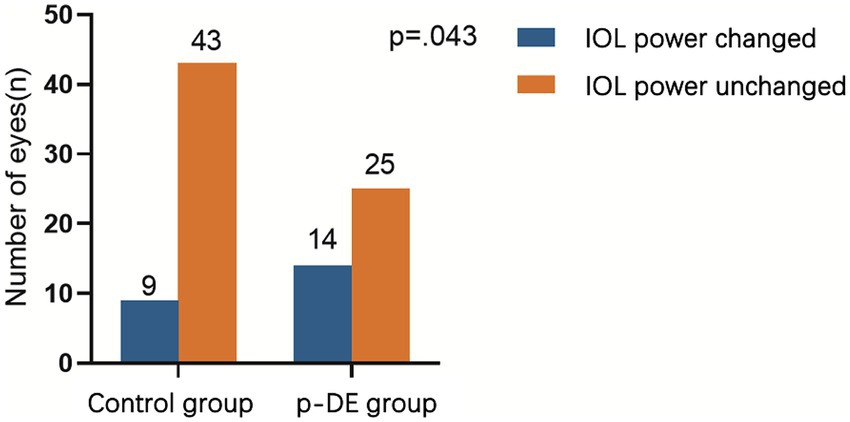 Figure 2. IOL power changes after DQS use. The number of eyes with IOL power change was significantly higher in the p-DE group than in the control group.