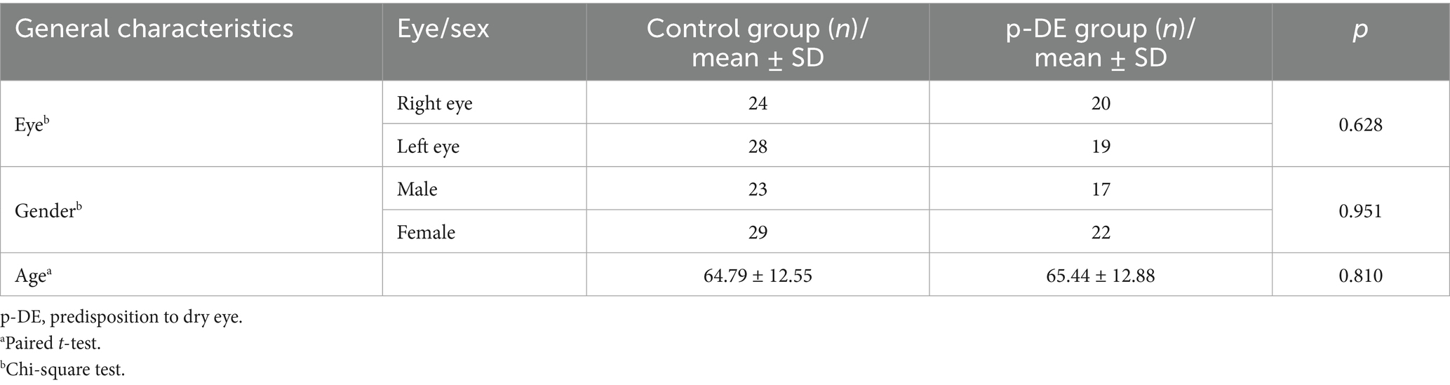 A prospective, observational study was conducted at the Ophthalmology clinic of Jiangsu Provincial People’s Hospital. In this study, the recruitment period started on July 1, 2022, and ended on July 1, 2023. The study was approved by the Medical Ethics Committee of the First Affiliated Hospital of Nanjing Medical University (2022-SR-337). All methods implemented in this study were conducted in accordance with relevant guidelines and regulations. Participants were informed of all examinations involved and provided with signed informed consent forms. According to the TFOS DEWS II (Tear Film & Ocular Surface Society Dry Eye Workshop II) 2017, all eyes were divided into the p-DE group [mean BUT (mBUT) <10 s] and control group (mBUT ≥10 s) (3, 13, 15).