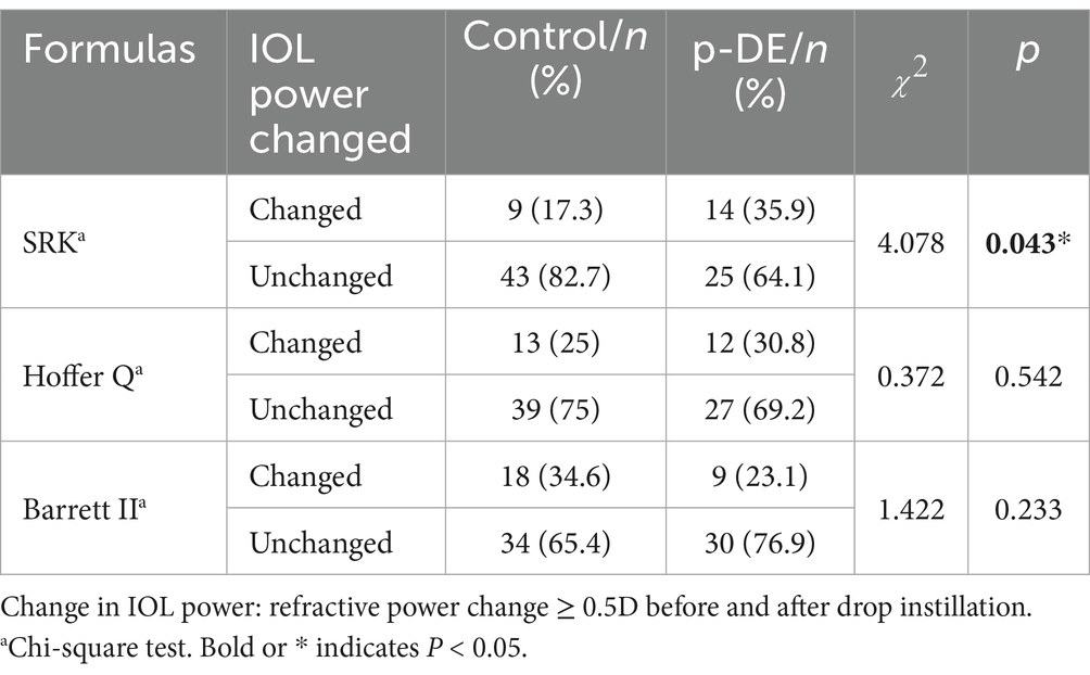 In p-DE eyes, 4 male eyes (23.5%) and 10 female eyes (45.5%) exhibited changes, while 13 male eyes (76.5%) and 12 female eyes (54.5%) showed no change (p > 0.05) (see Supplementary Table S3). In addition, we compared IOL power changes via other common cataract IOL calculation formulas (Hoffer Q and Barrett Universal II; Table 2) and found no significant intergroup difference between the p-DE and control groups (p > 0.05). However, within the p-DE group, IOL power calculated by the Hoffer Q formula increased significantly before and after DQS use (p < 0.05) (see Supplementary Table S5).