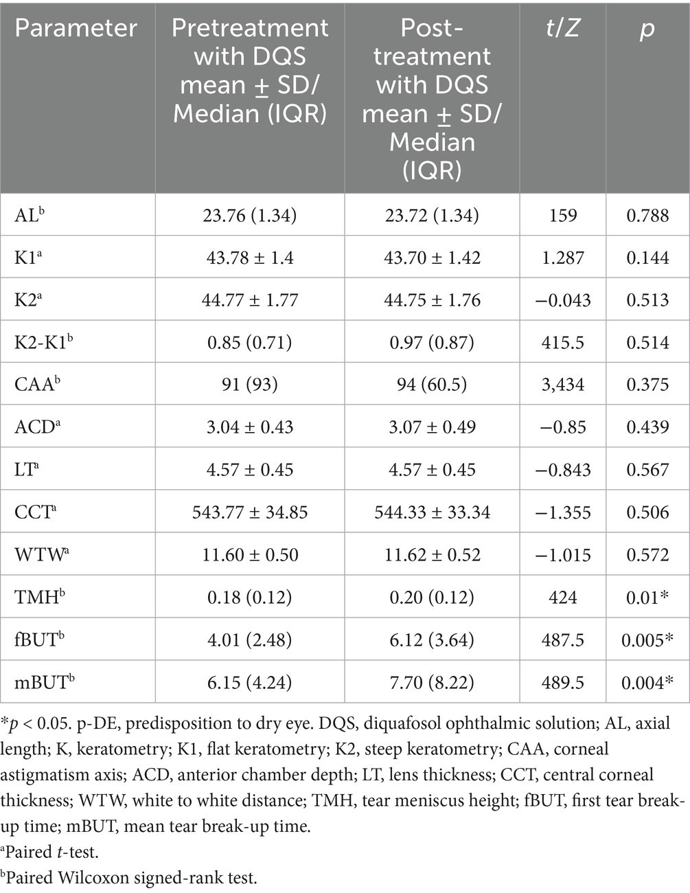 After using DQS eye drops, TMH, fBUT, and mBUT were all increased in p-DE group (p < 0.05), while the remaining parameters showed no significant differences (p > 0.05) (Table 3).