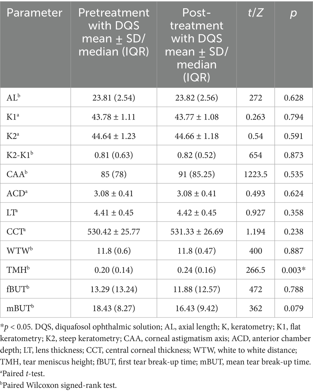 In this study, biological measurements were performed again at 5 min after DQS application, referring to the conclusion by Röggla et al. (1). They found that in cataract patients, after using artificial tears of different viscosities, the variability of keratometric measurements and astigmatism fluctuations both decreased to clinically acceptable ranges at 5 min, with a stable tear film ensuring measurement accuracy. This study revealed a high repeatability for parameters in both baseline measurements before DQS use, consistent with studies by Röggla and Yue Peng reporting high repeatability for AL, Km, K1, K2, ACD, LT, CCT, and WTW (1, 17).