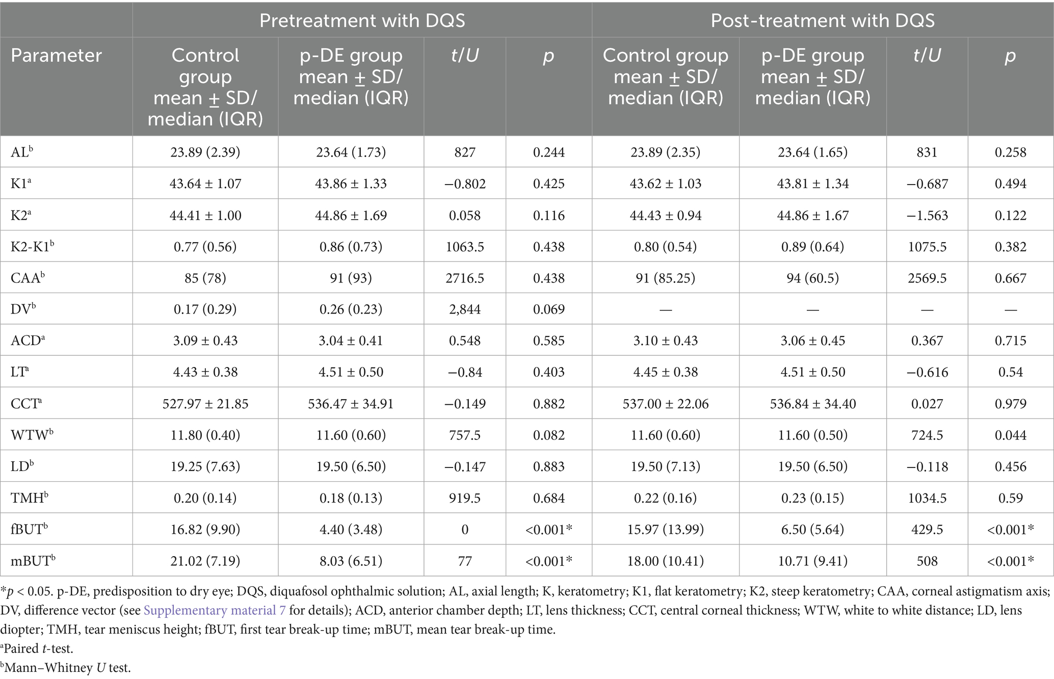 Results: Following DQS eye drops application, the p-DE group exhibited a higher number of eyes with changes in IOL power (calculated by SRK formula) and tear film stability (TFS) compared with the control group (p < 0.05) and the IOL power calculated by Hoffer Q formula also showed a statistical difference before and after DQS use (p < 0.05). After using DQS, the tear meniscus height (TMH), the first breakup time and the mBUT all increased in the p-DE group (p < 0.05), yet they were still lower than those in the control group. However, no significant differences were found in axial length, K value, corneal astigmatism axis, difference vector, anterior chamber depth, central corneal thickness, lens thickness, and white-to-white among all groups before and after DQS use (p > 0.05). Combined correlation analysis and logistic regression analysis revealed that changes in steep keratometry and TMH after treatment with DQS eye drops were the main factors affecting IOL power change. Additionally, mBUT before DQS use was identified as the primary factor affecting TFS change.