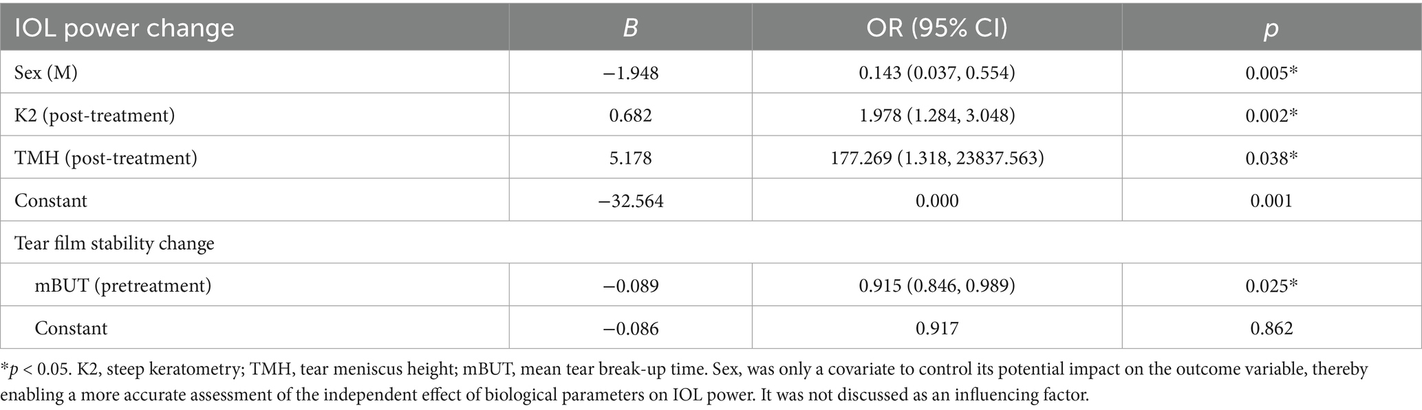 Age and gender were used as covariates of adjustment parameters, and a binary stepwise logistic regression analysis was carried out. The results showed that while controlling the effects of age and gender, the K value and TMH after using DQS were the main factors affecting the change in intraocular lens power (Table 6).