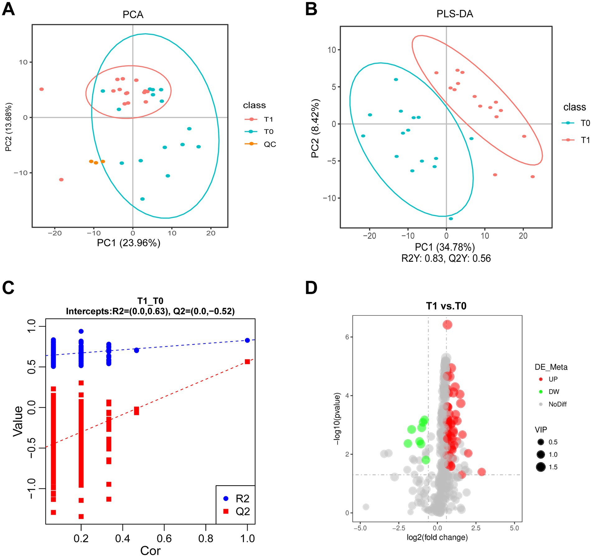 Panel A shows a PCA plot with classes T1, T0, and QC, each marked in different colors, and two principal components labeled. Panel B displays a PLS-DA plot indicating separation between T0 and T1. Panel C presents a permutation test with intercepts for R2 and Q2, demonstrating correlation values. Panel D is a scatter plot comparing T1 versus T0, indicating upregulated, downregulated, and non-differential data points, with point sizes representing VIP scores.