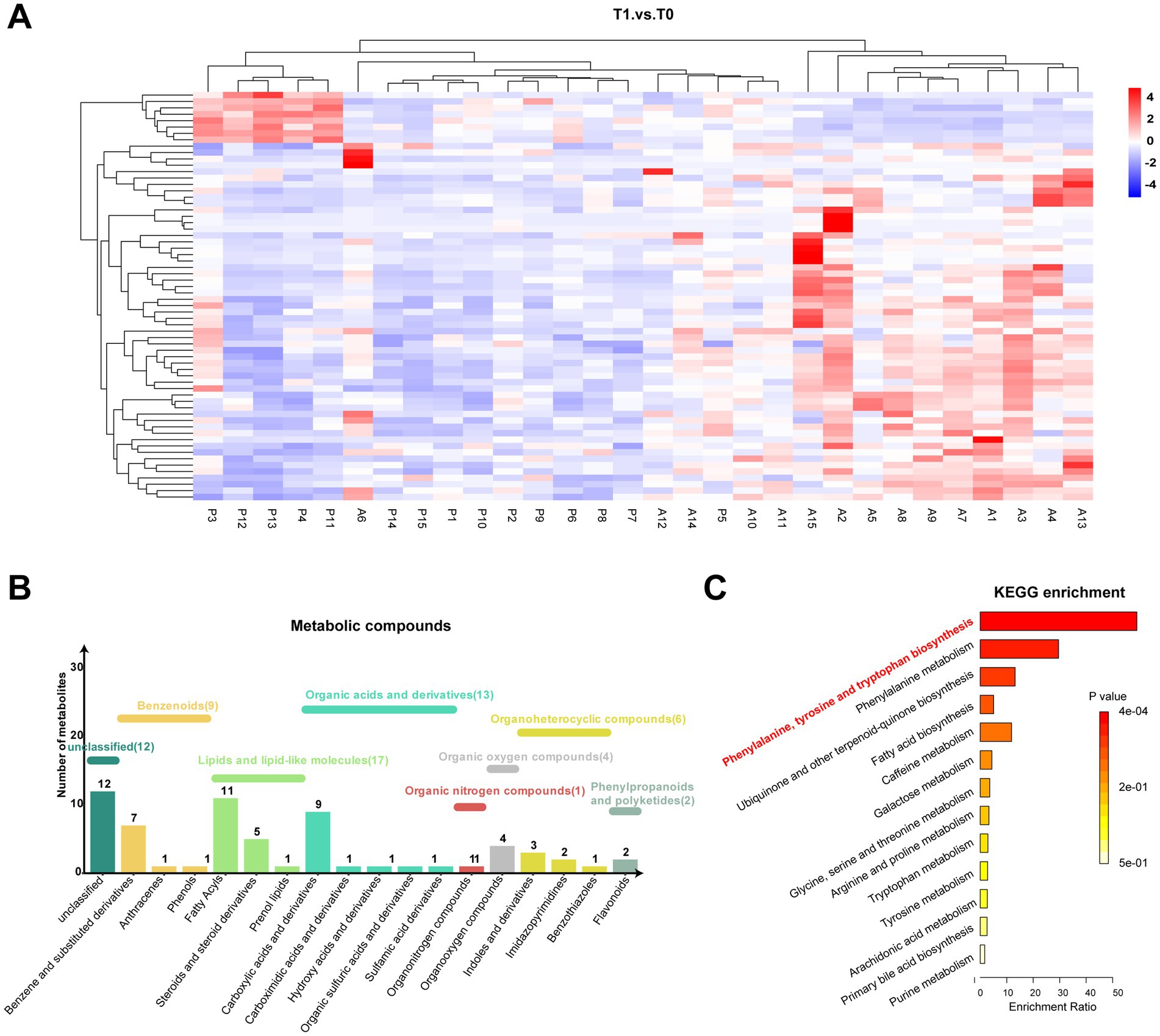 Heatmap and bar charts illustrating metabolite data and KEGG pathway enrichment. Panel A is a heatmap comparing T1 versus T0 with hierarchical clustering, showing variations in red and blue tones. Panel B displays a bar chart of different metabolic compounds, categorized by type, indicating the count of metabolites. Panel C contains a bar chart of KEGG enrichment pathways with labels for enrichment ratio and p-values, highlighting pathways such as tryptophan biosynthesis and phenylalanine metabolism.