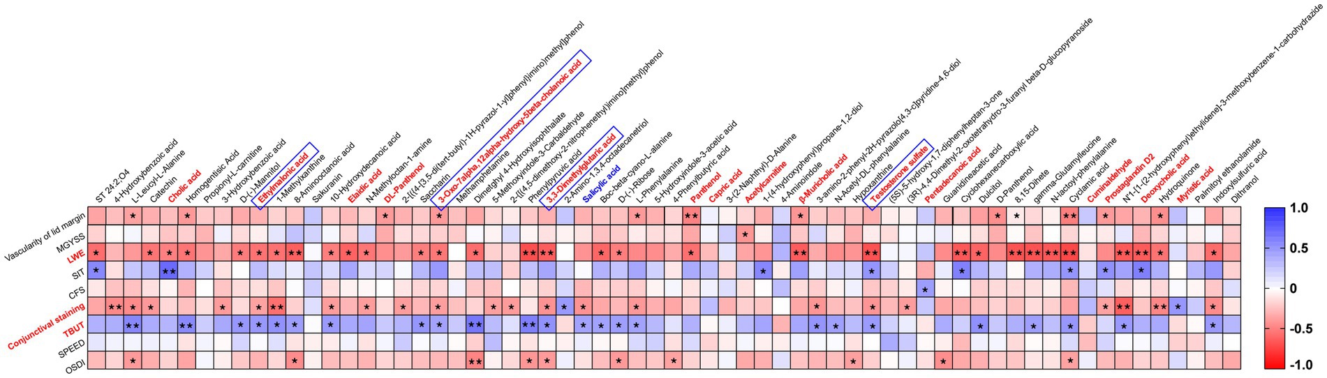 Subsequent correlation analysis revealed significant moderate correlations between the tear metabolites and clinical parameters (Figure 3). Many metabolites exhibited positive and negative correlations with TBUT, LWE, and conjunctival staining, with LWE showing particularly strong correlations. Lipid molecules are crucial for tear film stability and evaporation prevention (26). Of the 17 lipids and lipid-like molecules analyzed, four metabolites showed a positive correlation with TBUT. The compounds 3,3-dimethylglutaric acid (r = 0.428) and ethylmalonic acid (r = 0.407) belong to the fatty acyl group, while 3-oxo-7alpha,12alpha-hydroxy-5beta-cholanoic acid (r = 0.363) and testosterone sulfate (r = 0.392) are categorized as steroids and their derivatives. Moreover, the levels of anti-inflammatory prostaglandin D2 (PGD2) were negatively related to the vascularity of the lid margin and conjunctival staining and positively associated with the SIT. Additionally, the presence of salicylic acid, another non-steroidal anti-inflammatory molecule present in tears, was related to TBUT and conjunctival staining.