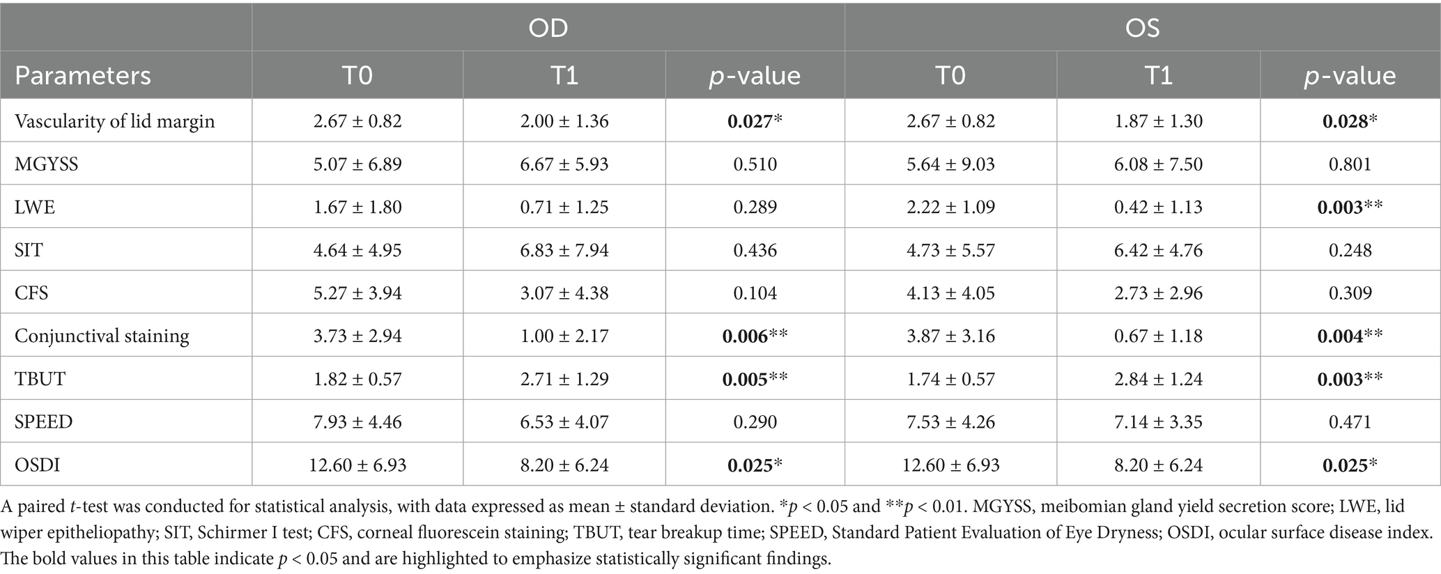 Paired t-tests were used to assess differences in ocular parameters between pre- and post-treatment samples that followed a normal distribution, with results expressed as mean ± standard deviation. Clinical parameter analyses were conducted using SPSS 18.0, with statistical significance set at a two-tailed p-value of <0.05.
