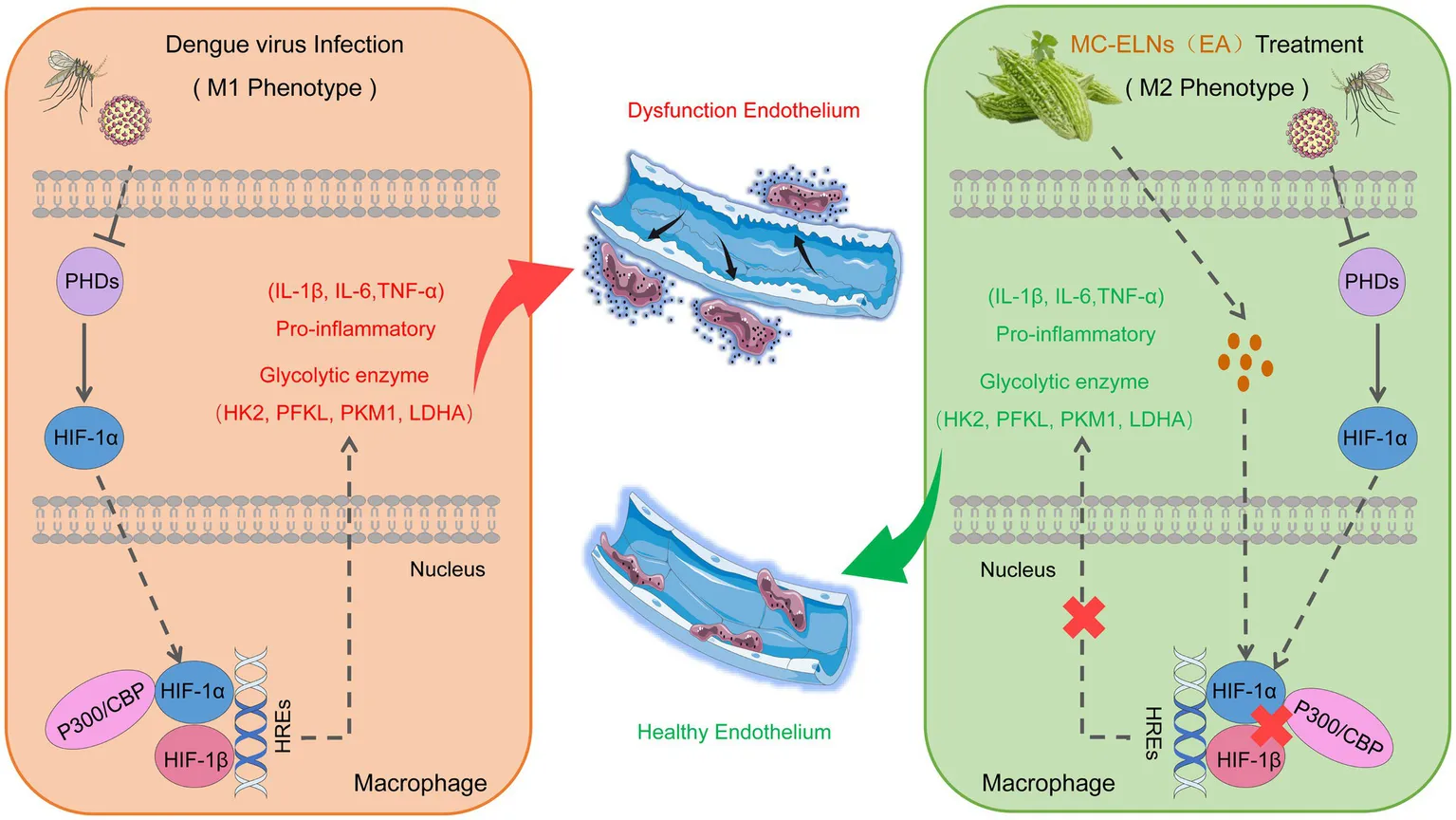 MC-ELNs and EA significantly alleviated DENV-induced macrophage inflammation without affecting HIF-1α expression or nuclear translocation. They shifted macrophage polarization from pro-inflammatory M1 to anti-inflammatory M2 phenotype, downregulated glycolytic enzymes (HK2, PFKL, PKM1, LDHA), suppressed phagocytosis, reduced secretion of endothelial damage-associated mediators (IL-1β, IL-6, TNF-α, MMP-9), and enhanced IL-10 production. Mechanistically, both interventions inhibited the interaction between HIF-1α and p300/CBP, thereby decoupling inflammatory activation from metabolic reprogramming.