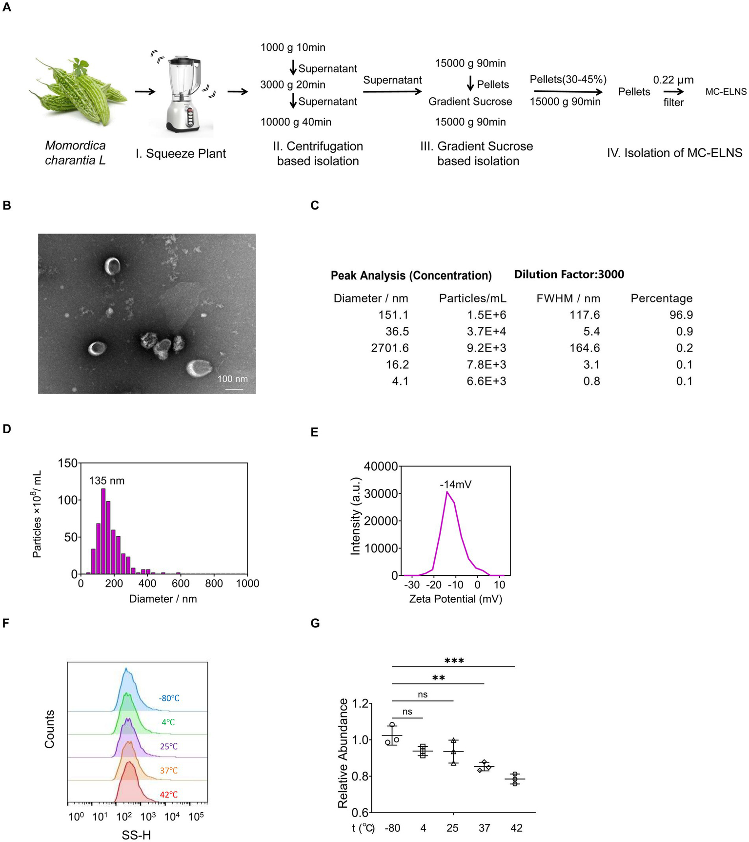To isolate intact extracellular vesicles from Momordica charantia L. (MC-ELNs), we employed a combination of ultracentrifugation and density gradient centrifugation (Figure 1A). Transmission electron microscopy (TEM) confirmed the presence of nanovesicles with intact bilayer membrane structures (Figure 1B). Nanoparticle tracking analysis (NTA) using a Multiple-Laser ZetaView® f-NTA system revealed a predominant subpopulation of vesicles with a diameter of 151.1 nm (96.9% of the total), and an overall mean particle size of 135 nm (Figures 1C,D). The vesicles exhibited a net negative surface charge (Figure 1E). To assess thermostability, MC-ELNs were subjected to five temperature regimens: −80 °C for 1 month, 4 °C for 1 week, 25 °C for 24 h, 37 °C for 12 h, and 42 °C for 6 h. Nanoflow cytometry (NanoFCM) analysis indicated that these conditions did not significantly affect vesicle size relative to the −80 °C control (Figure 1F). Although particle counts remained stable at 4 °C and 25 °C, incubation at 37 °C and 42 °C led to a decrease in vesicle numbers; nevertheless, relative abundance remained above 80% (Figure 1G).