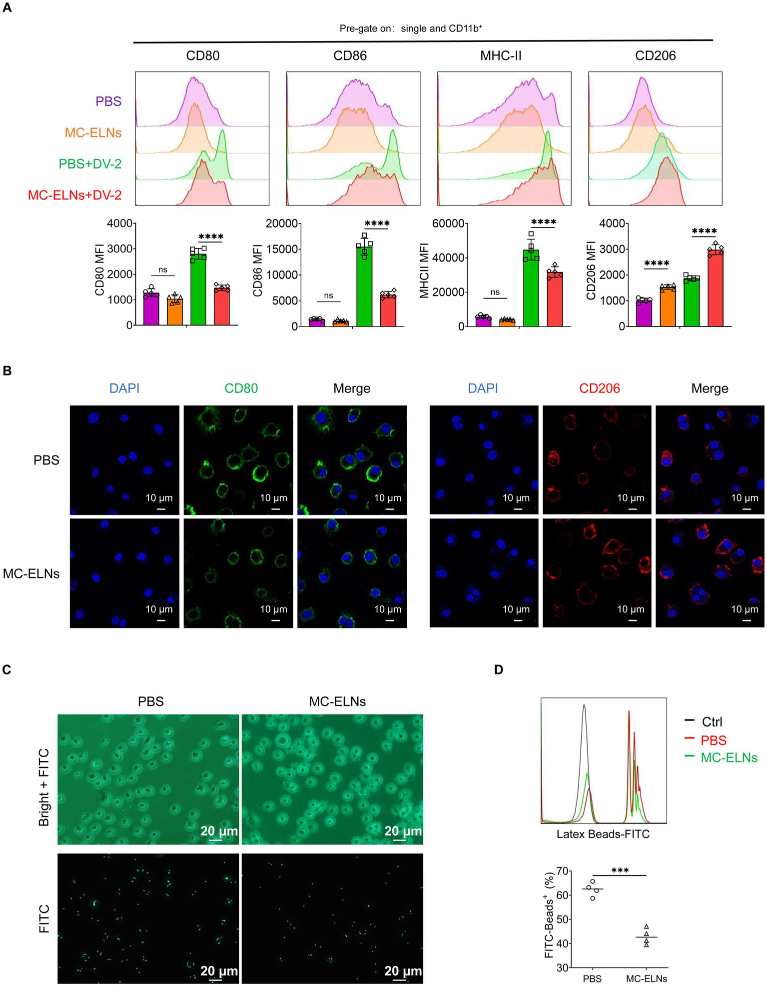 To evaluate whether MC-ELNs modulate immune responses in dengue virus (DENV-2 strain 16,681)-infected bone marrow-derived macrophages (BMDMs), we treated cells with MC-ELNs post-infection. Flow cytometry analysis of polarization markers (CD80, CD86, MHC-II, and CD206) revealed that MC-ELNs significantly downregulated the expression of M1 markers (CD80, CD86, and MHC-II) while upregulating the M2 marker CD206, compared to the phosphate-buffered saline (PBS) group (Figure 2A). Immunofluorescence staining of the CD80 and CD206 further supported a shift toward M2 polarization (Figure 2B), consistent with flow cytometry data. However, MC-ELNs treatment did not trigger repolarization of M2 macrophages toward the M1 phenotype (Supplementary Figure 1). To assess whether polarization changes influenced functional behavior, we measured we measured phagocytic activity using FITC-conjugated latex beads (Figure 2C). Internalization was confirmed microscopically, and flow cytometry revealed that MC-ELNs markedly suppressed phagocytosis in DENV-2-infected BMDMs (Figure 2D).
