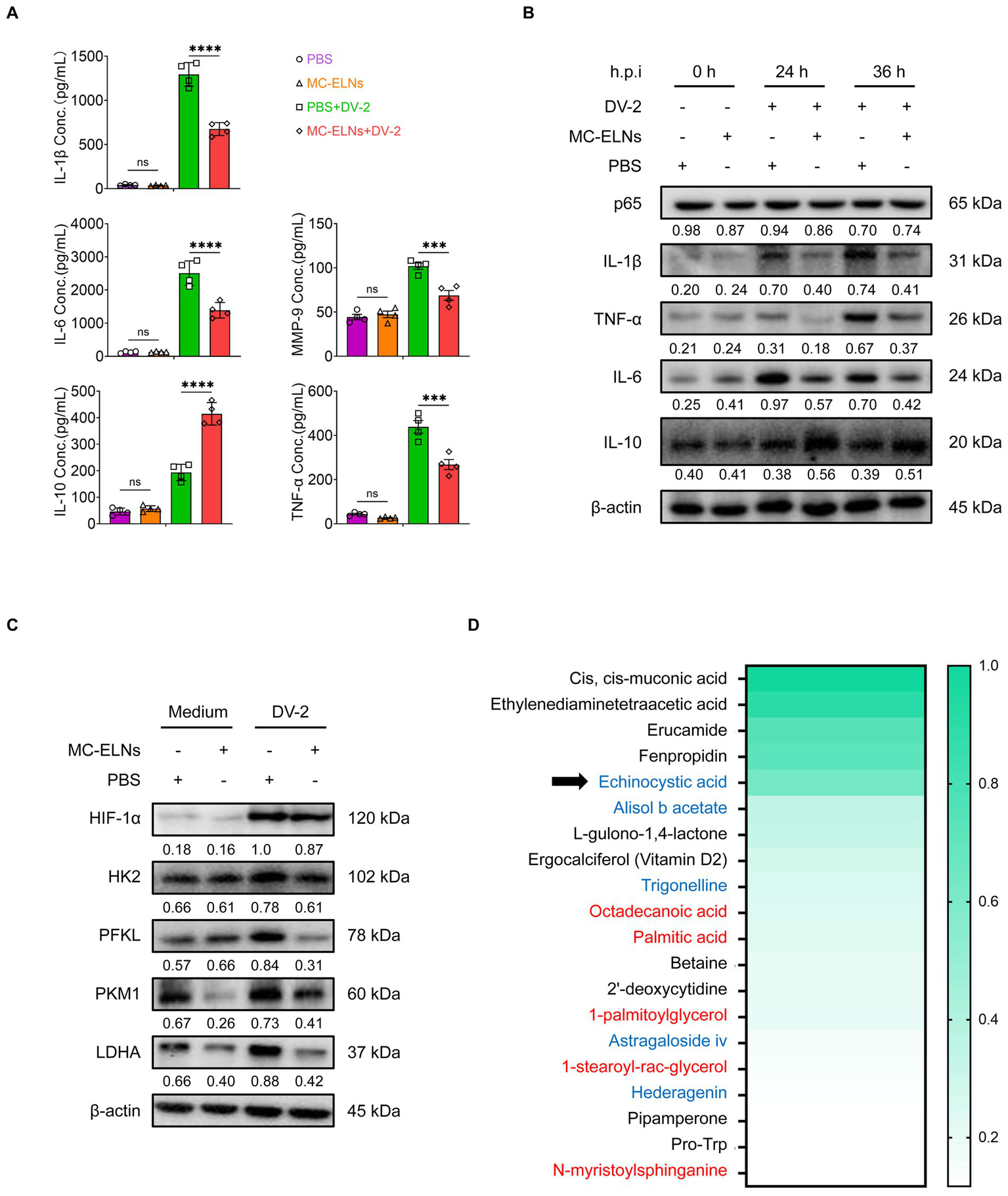 Immunomodulatory function and composition of MC-ELNs. (A) ELISA analysis of IL-1β, IL-6, IL-10, TNF-α and MMP-9 in DENV-2-infected BMDMs (MOI = 5) treated with MC-ELNs (10 μg/mL, 24 h; n = 4). (B) Western blot assay of the regulatory effects of MC-ELNs on Inflammatory mediators and the NF-κB core subunit p65 proteins following DENV-2 infection at MOI = 5 at 0, 24, 36 h, Brefeldin A (300 ng/mL) was added for the last 3 h of stimulation at the indicated time points. (C) Western blot assay of the regulatory effects of MC-ELNs on glycolysis-associated proteins following DENV-2 infection at MOI = 5 at 36 h. (D) Untarget metabolomics identifies the top 20 metabolites in MC-ELNs in terms of relative expression abundance, with echinocystic acid (EA) ranking fifth, the substances in red font are Structural Lipids & Membrane Components, while the substances in blue font are Natural Products & Phytochemicals. A two-way ANOVA with Šidák’s post hoc test was used for statistical analysis. Data are presented as mean ± SD and are representative of at least three experiments with similar observations. *p < 0.05, **p < 0.01, ***p < 0.001, ****p < 0.0001. ANOVA, analysis of variance; SD, standard deviation; hpi, hours postinfection.