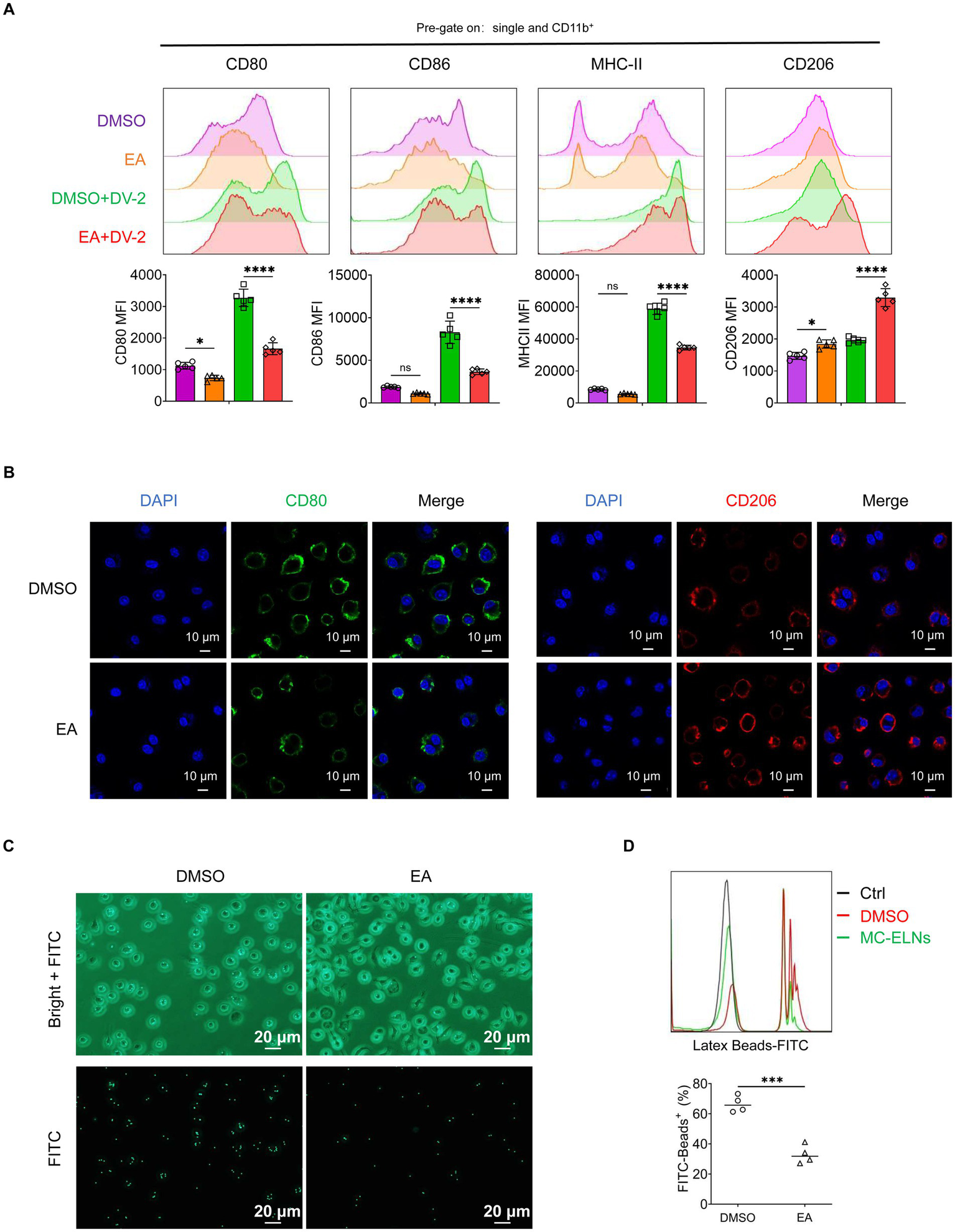 To determine whether EA is a functional component of MC-ELNs, BMDMs were treated with EA after DENV-2 infection. Similar to MC-ELNs, EA downregulated M1 markers (CD80, CD86, and MHC-II) and enhanced CD206 expression (Figure 4A). Consistent with the polarization pattern observed with MC-ELNs, Immunofluorescence confirmed the promotion of an M2-like phenotype, as demonstrated by decreased CD80 and increased CD206 fluorescence signals (Figure 4B). Furthermore, EA treatment similarly suppressed phagocytosis also characteristic of MC-ELNs as evidenced in functional assays (Figures 4C,D).
