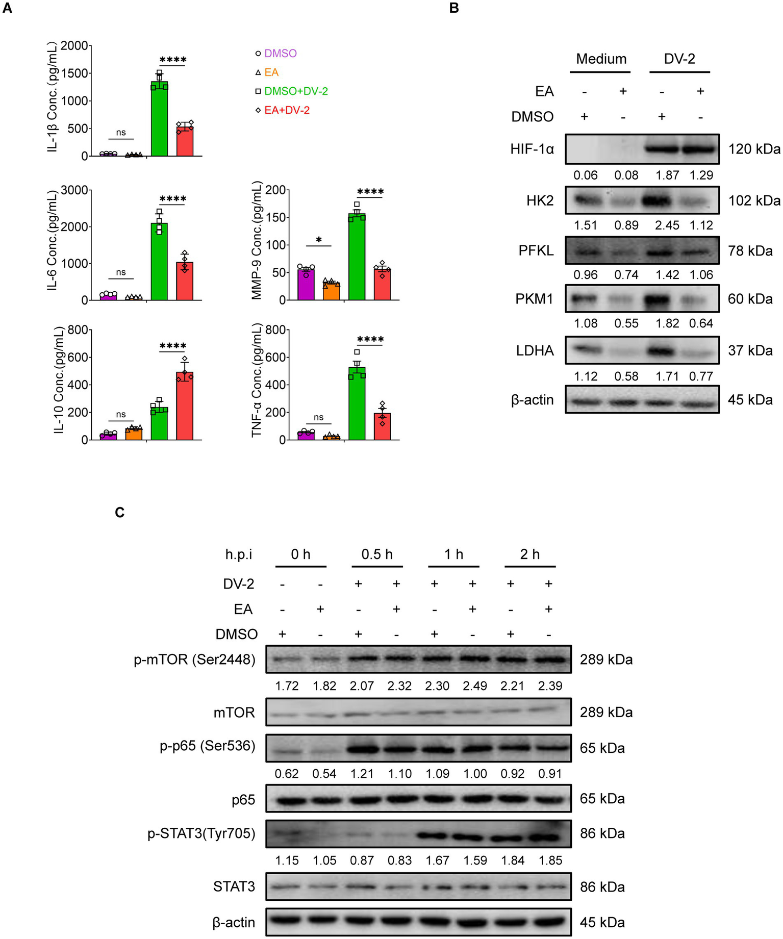 HIF-1α expression-independent immune regulation by EA in BMDMs. (A) ELISA analysis of IL-1β, IL-6, IL-10, TNF-α and MMP-9 in DENV-2-infected BMDMs (MOI = 5) treated with EA (5 μM, 24 h; n = 4). (B) Western blot assay of the regulatory effects of EA on glycolysis-associated proteins following DENV-2 infection at MOI = 5 at 36 h. (C) Western blot assay of the regulatory effects of EA (5 μM) on activation of signaling pathways following DENV-2 infection at MOI = 5 as indicated times. A two-way ANOVA with Šidák‘s post hoc test was used for statistical analysis. Data are presented as mean ± SD and are representative of at least three experiments with similar observations. *p < 0.05, **p < 0.01, ***p < 0.001, ****p < 0.0001. ANOVA, analysis of variance; SD, standard deviation; hpi, hours postinfection; p-, phosphorylated.