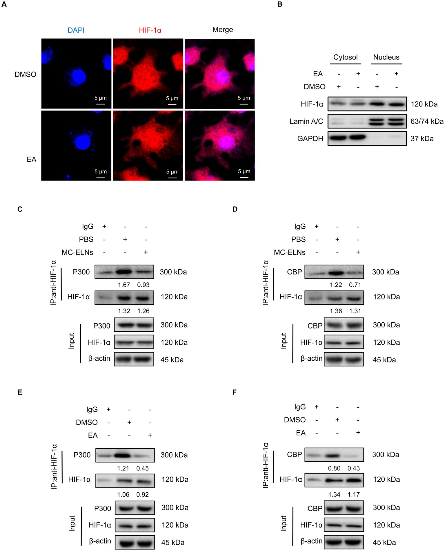 MC-ELNs/EA exert immunomodulatory effects by regulating the interaction between HIF-1α and the co-activators p300/CBP. DENV-2-infected BMDMs (MOI = 5) treated with MC-ELNs (10 μg/mL) or EA (5 μM, 4 h); (A) Immunofluorescence assays of HIF-1α intracellular locations in DENV-2-infected BMDMs treated with EA; (B) Western blotting of HIF-1α in the cytosol and nucleus fraction of DENV-2-infected BMDMs treated with EA; Lamin A/C and GAPDH were used as nuclear and cytoplasmic protein markers, respectively; (C,D) Co-immunoprecipitation (Co-IP) assays showed that MC-ELNs attenuated the interaction between HIF-1α and the co-activator p300 (C) and CBP (D); (E,F) Co-immunoprecipitation (Co-IP) assays showed that EA attenuated the interaction between HIF-1α and the co-activator p300 (E) and CBP (F); Protein–protein interactions were immunodetected using HIF-1α antibodies, protein extracts (input) were immunoprecipitated with HIF-1α, p300, CBP or β-actin antibody and resolved by SDS-PAGE. DAPI, 4′,6-diamidino-2-phenylindole.