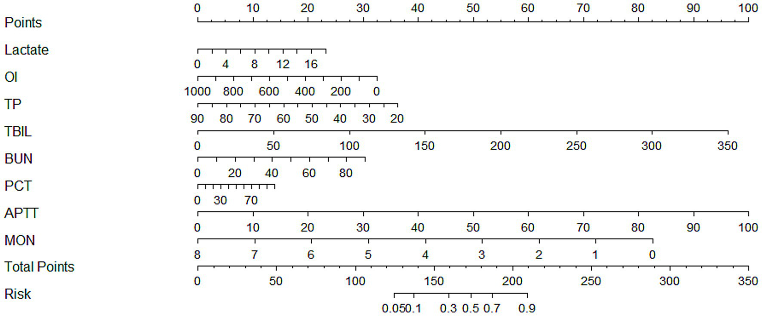 Nomograms are effective graphical visualization tools that help users quickly and accurately process complex data for prediction without the use of computers or other tools. Nomograms are graphical representations of complex mathematical formulas, typically using biological markers and clinical variables, and are depicted graphically, with the result being the probability of a clinical event (e.g., disease occurrence or death) for a given individual (12). In recent years, scholars have explored the role of a nomogram model constructed based on public databases in the prognosis of SIC patients and found that the model provides a better prediction of 28-day mortality in SIC patients, leading to a better assessment of prognosis (13).