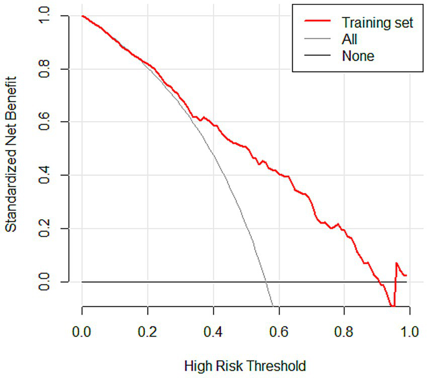 Subsequently, the variables obtained from the LASSO screening were further included in the multifactorial logistic regression analysis to clarify the independent risk factors for SIC. Based on the final regression model, a nomogram prediction model was constructed using the rms software package, and the receiver operating characteristic curve (ROC) was plotted, and the discriminative performance of the model was evaluated by calculating the area under the curve (AUC) as well as by determining the optimal cutoff values corresponding to the sensitivity and The discriminative performance of the model was evaluated by calculating AUC and determining the sensitivity and specificity indexes corresponding to the optimal cutoff value. The calibration curve was further plotted by the rms package and subjected to the Hosmer-Lemeshow goodness-of-fit test to evaluate the calibration capability of the model. The calibration of the nomogram model was assessed using calibration curves. A coordinate system was constructed with the predicted probability on the horizontal axis and the observed probability on the vertical axis. The Ideal line represents perfect agreement between predicted and observed outcomes. The Apparent line indicates the actual performance of the model on the dataset, while the Bias-corrected line reflects the prediction results obtained after 1,000 bootstrap resamples, which reduces potential overfitting and provides an internally validated estimate of model performance. The rmda software package was used to draw a decision curve analysis (DCA) plot to analyze the net benefit of the model under different threshold probabilities and determine its clinical application value. In the DCA plot, the None line represents an extreme case, i.e., the model predicts that all sepsis patients will not develop SIC, at which time the net clinical benefit is zero. The All line represents the other extreme, i.e., the model predicts that all sepsis patients will develop SIC, when the slope of the net clinical benefit is negative. The net clinical benefit is determined by the threshold probability range, i.e., the model curve lies above the None and All reference lines. If the model curve is above the None and All lines, this indicates that the model has a higher net benefit in actual clinical application. Finally, the constructed nomogram models were externally validated in an independent validation set and evaluated for their predictive performance and generalization ability.