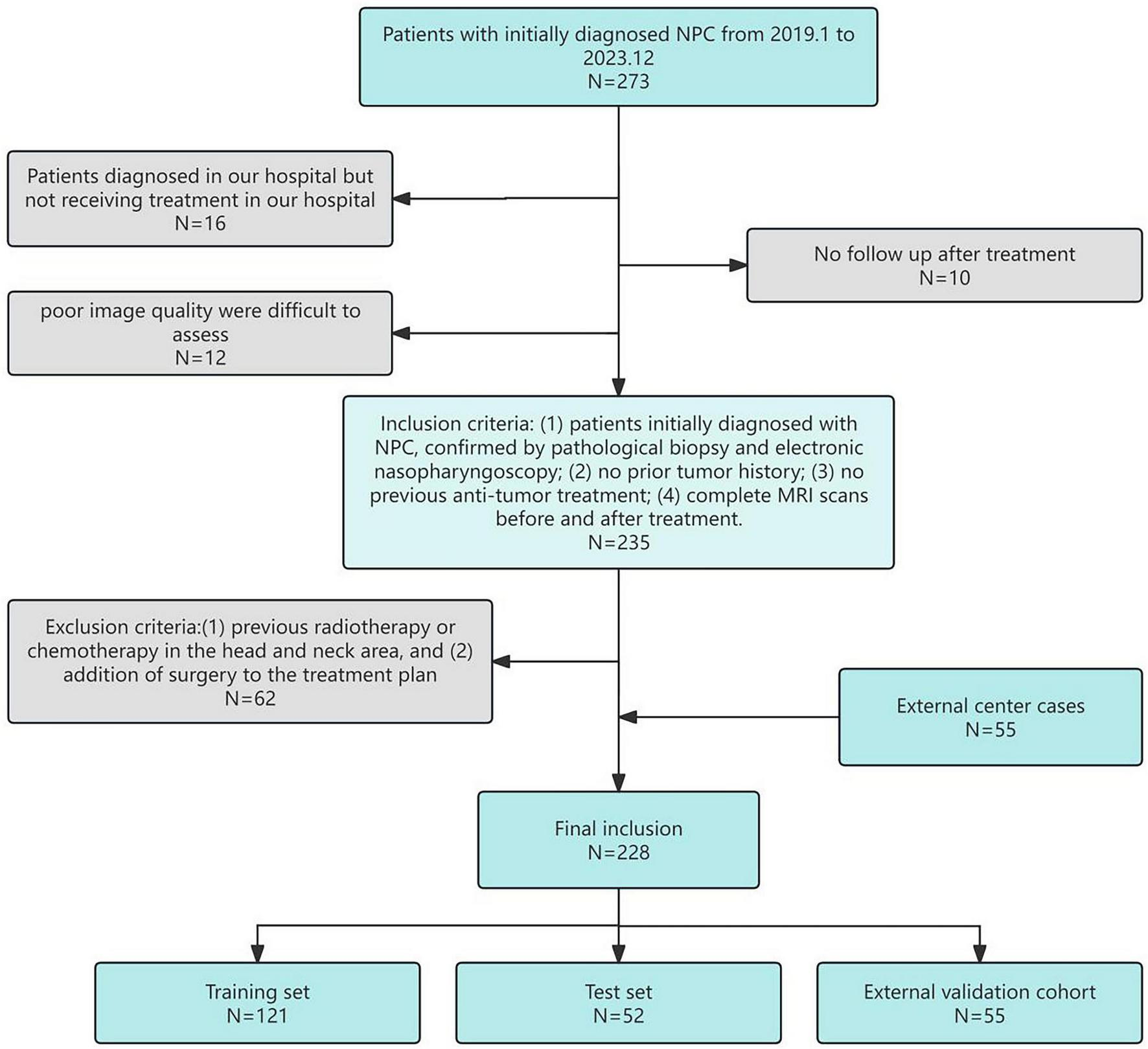 This study analyzed data from 173 NPC patients (93 positive and 80 negative cases*) initially diagnosed at the Second Affiliated Hospital of Fujian Medical University between January 2019 and December 2023. Positive cases were defined as those showing complete metabolic response on post-treatment PET-CT, while negative cases had residual metabolic activity. To enhance the validity of our findings, we incorporated an additional 55 cases (37 positive and 18 negative) from Ningde Municipal Hospital as an external validation cohort during the same study period. Collected data included gender, age, clinical TNM stage (the American Joint Committee on Cancer Manual’s 8th edition served as the standard), treatment methods, and MRI before and after treatment. Patients received follow-up examinations every 3 months after treatment, primarily with MRI, for a minimum of 6 months. The study adhered to the Declaration of Helsinki and was approved by the Ethics Committee of the Second Affiliated Hospital of Fujian Medical University, with informed consent obtained from all participants. The patient selection process is detailed in Figure 2, the inclusion criteria included: (1) patients initially diagnosed with NPC, confirmed by pathological biopsy and electronic nasopharyngoscopy; (2) no prior tumor history; (3) no previous anti-tumor treatment; (4) complete MRI scans before and after treatment. Exclusion criteria included: (1) previous radiotherapy or chemotherapy in the head and neck area, and (2) addition of surgery to the treatment plan.