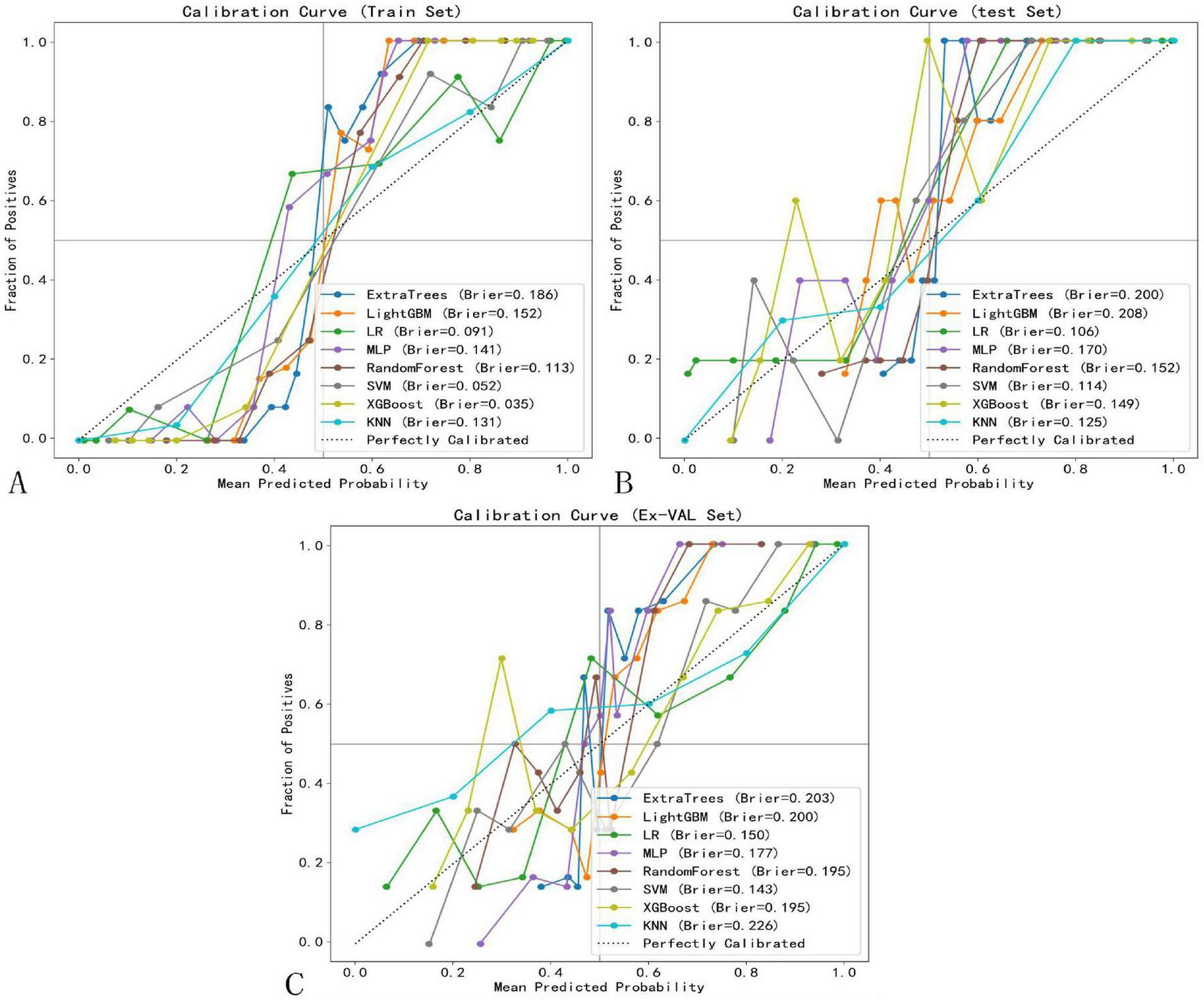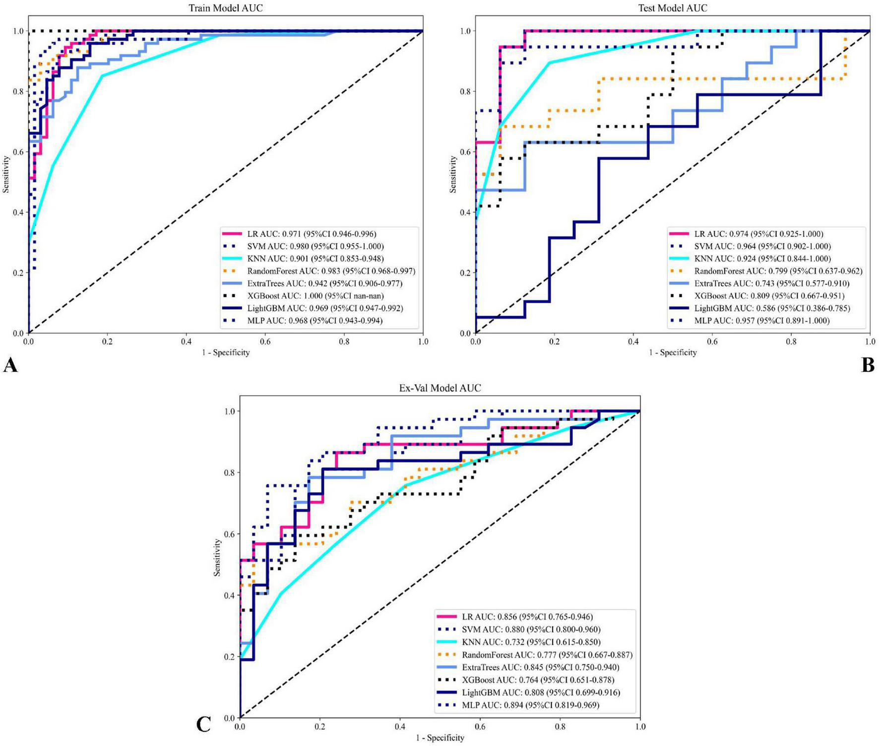 The top 100 most informative and non-redundant features were initially selected from the robust feature pool (ICC > 0.85) using the maximum relevance minimum redundancy (mRMR) algorithm. This step prioritizes features with high predictive power that are minimally correlated with each other. These 100 features were subsequently subjected to Least Absolute Shrinkage and Selection Operator (LASSO) regression with 10-fold cross-validation to further refine the feature set and enforce sparsity. The optimal regularization parameter lambda (λ) was determined to be 0.0450 based on the minimum binomial deviance criterion. This final step resulted in the selection of 24 features with non-zero coefficients, which were used for subsequent model construction. For model training, with 10-fold cross-validation applied to the training set for robustness. To ensure generalizability, the final selected model was independently validated on an external cohort (n = 55) from Ningde Municipal Hospital, which underwent identical feature preprocessing and standardization procedures as the primary cohort. Various machine learning algorithms, including SVM, K-Nearest Neighbors (KNN), Random Forest (RF), Extra Trees (ET), XGBoost, LightGBM, Multi-layer Perceptron (MLP), and Logistic Regression (LR), were tested and evaluated based on accuracy, sensitivity, specificity, and area under the receiver operating characteristic (ROC) curve. Decision Curve Analysis (DCA) was subsequently applied to both internal and external cohorts to quantify clinical utility across populations (29, 30). To ensure an unbiased performance estimate and prevent data leakage at all stages, a nested cross-validation pipeline was rigorously implemented. The entire model development processested crosscy, sensitivity, specificity, and area umRMR and LASSO), and hyperparameter tuning via scikit-optimize—ptimizevia scikiting via scikittuning via ps of the cross-validation, operating solely on the training folds. The outer loop was used exclusively for performance evaluation. A schematic diagram of this pipeline, clearly illustrating the separation of the tuning/feature selection and evaluation phases, is provided in Supplementary Figure 1. Hyperparameter optimization was conducted using Bayesian optimization via the scikit-optimize library over 100 iterations. The objective was to maximize the mean area under the ROC curve (AUC) from a ten-fold inner cross-validation on the training set. The complete set of optimal hyperparameters identified for each machine learning model is provided in Supplementary Table 1.