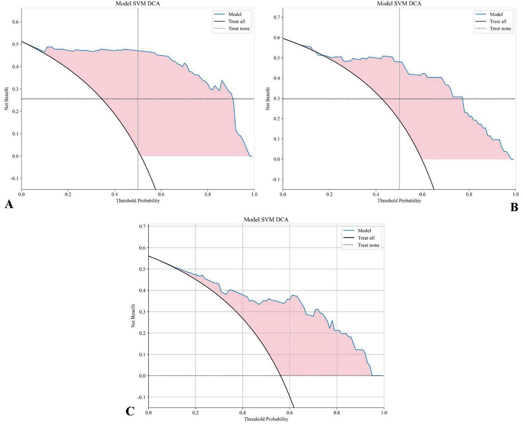 The Support Vector Machine (SVM) model demonstrated superior performance, achieving an area under the curve (AUC) of 0.935 (95% CI: 0.867–1.000) on internal testing with balanced sensitivity (87.1%) and specificity (95.2%). External validation confirmed model robustness (AUC 0.880, 95% CI: 0.800–0.960). Our radiomics approach significantly outperformed all clinical biomarkers (AUC improvement: 18.7–24.3%, p < 0.01) and demonstrated clinical utility across decision probability thresholds of 12–48%.