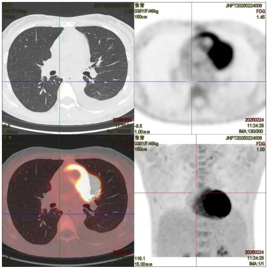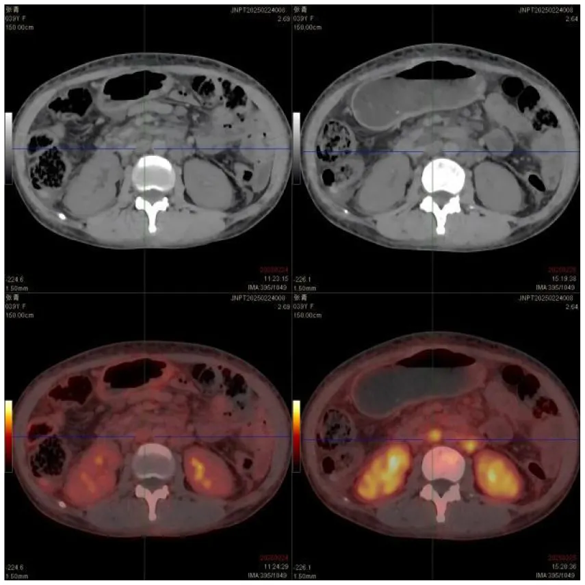 | PET/CT: | ① Multiple enlarged lymph nodes in bilateral neck I–V area, bilateral axilla, bilateral hilar region, mediastinum, abdominal cavity, retroperitoneum, and bilateral iliac vascular pathway area, mild increase in FDG metabolism, increased expression of CXCR4 to varying degrees; multiple enlarged lymph nodes ② Enlarged spleen, CXCR4 expression increased diffusely | |