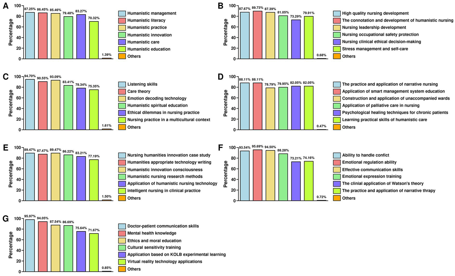 Course popularity and preferences across humanistic nursing training modules. (A) Training content demand in humanistic nursing system; (B) Course popularity in humanistic literacy training module; (C) Course popularity in humanistic nursing practice training; (D) Course preferences in the humanistic care module; (E) Course popularity in humanistic nursing innovation module; (F) Course preferences in the humanistic care module (skills-focused); (G) Course preferences in humanistic nursing education module.