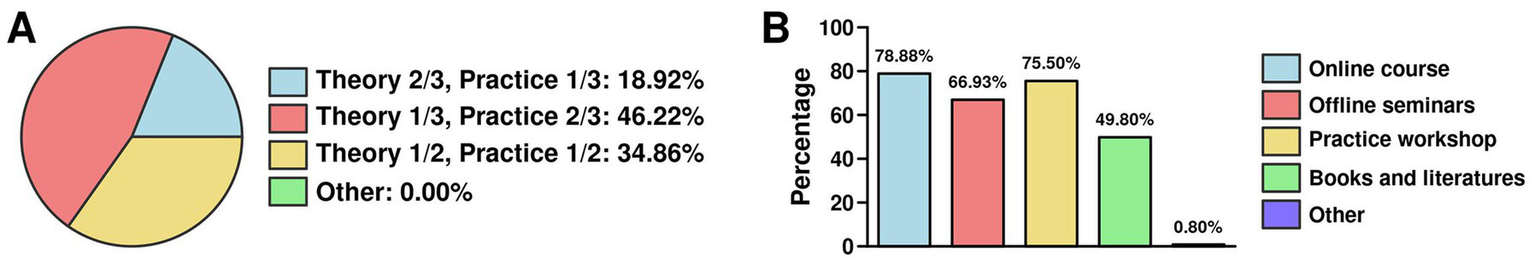 Preferences for training delivery methods and training focus in humanistic nursing. (A) Preference for training focus: theory vs. practice; (B) Preferred methods for delivering humanistic nursing system training.