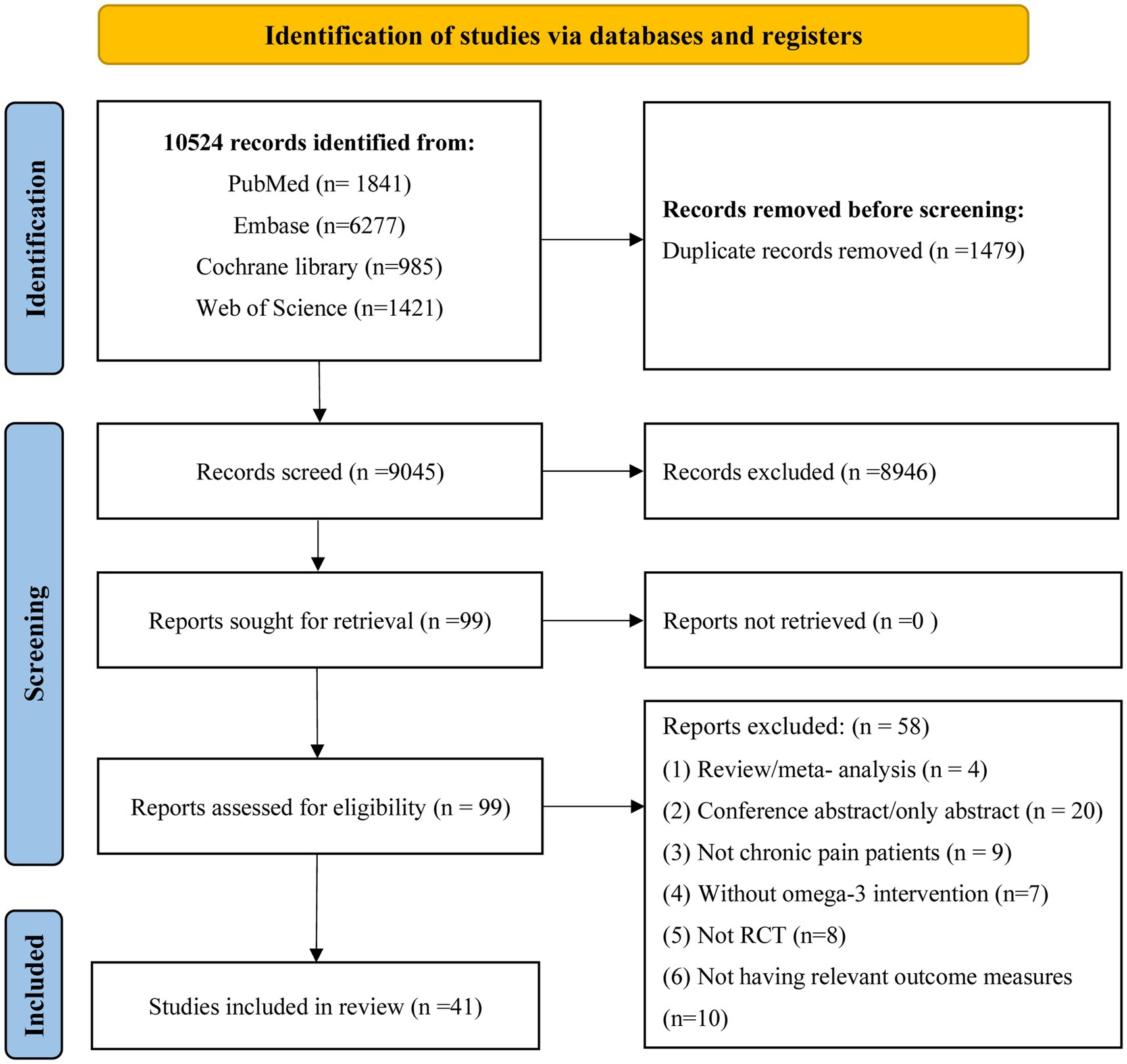 Flowchart illustrating the identification and screening of studies. Initially, 10,524 records are identified from four databases: PubMed, Embase, Cochrane Library, and Web of Science. After removing 1,479 duplicates, 9,045 records are screened, and 8,946 are excluded. Out of 99 reports sought for retrieval, none are unretrieved. Eligibility assessment results in 58 exclusions for various reasons, such as not being RCTs or lacking relevant outcomes. Ultimately, 41 studies are included in the review.