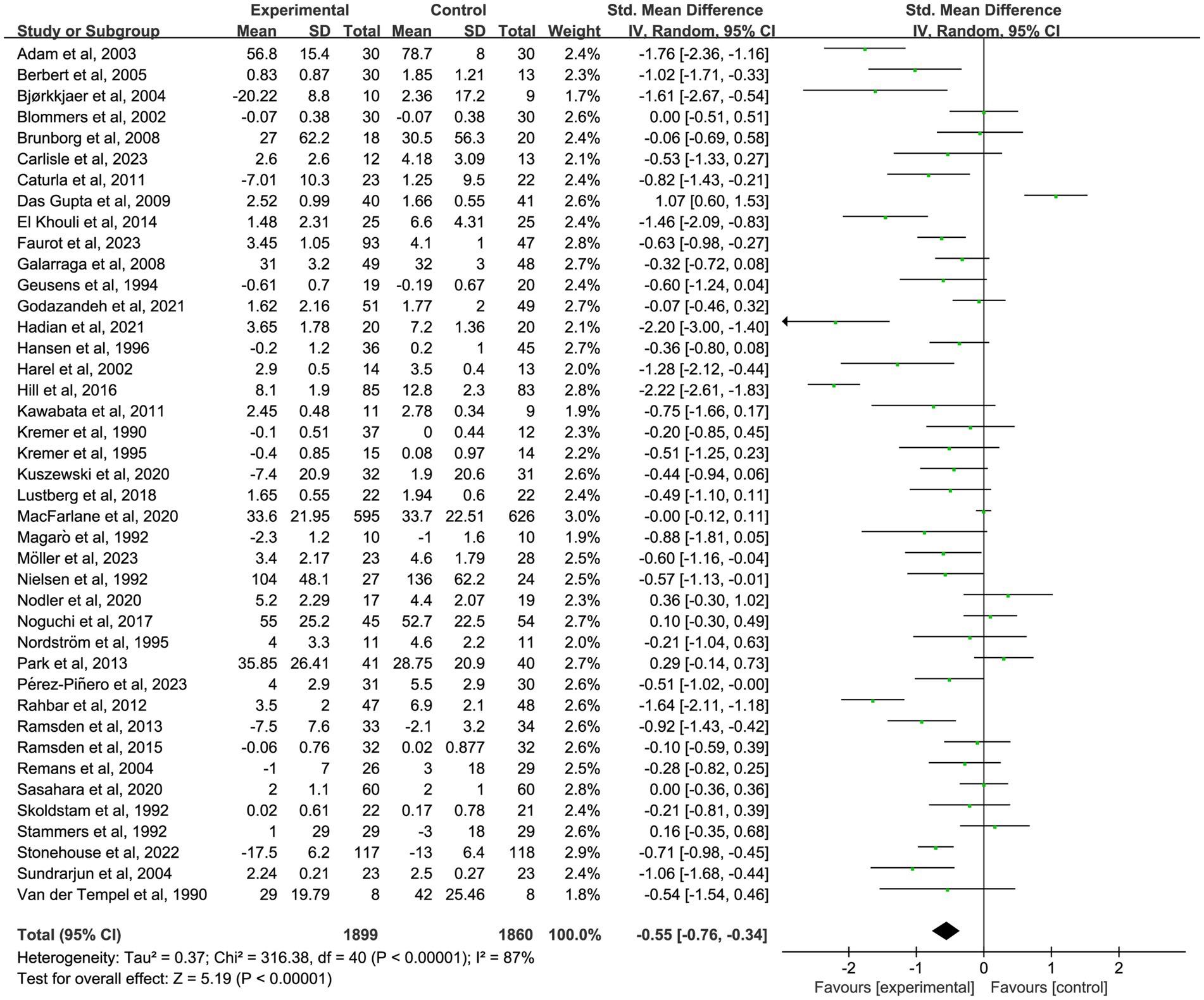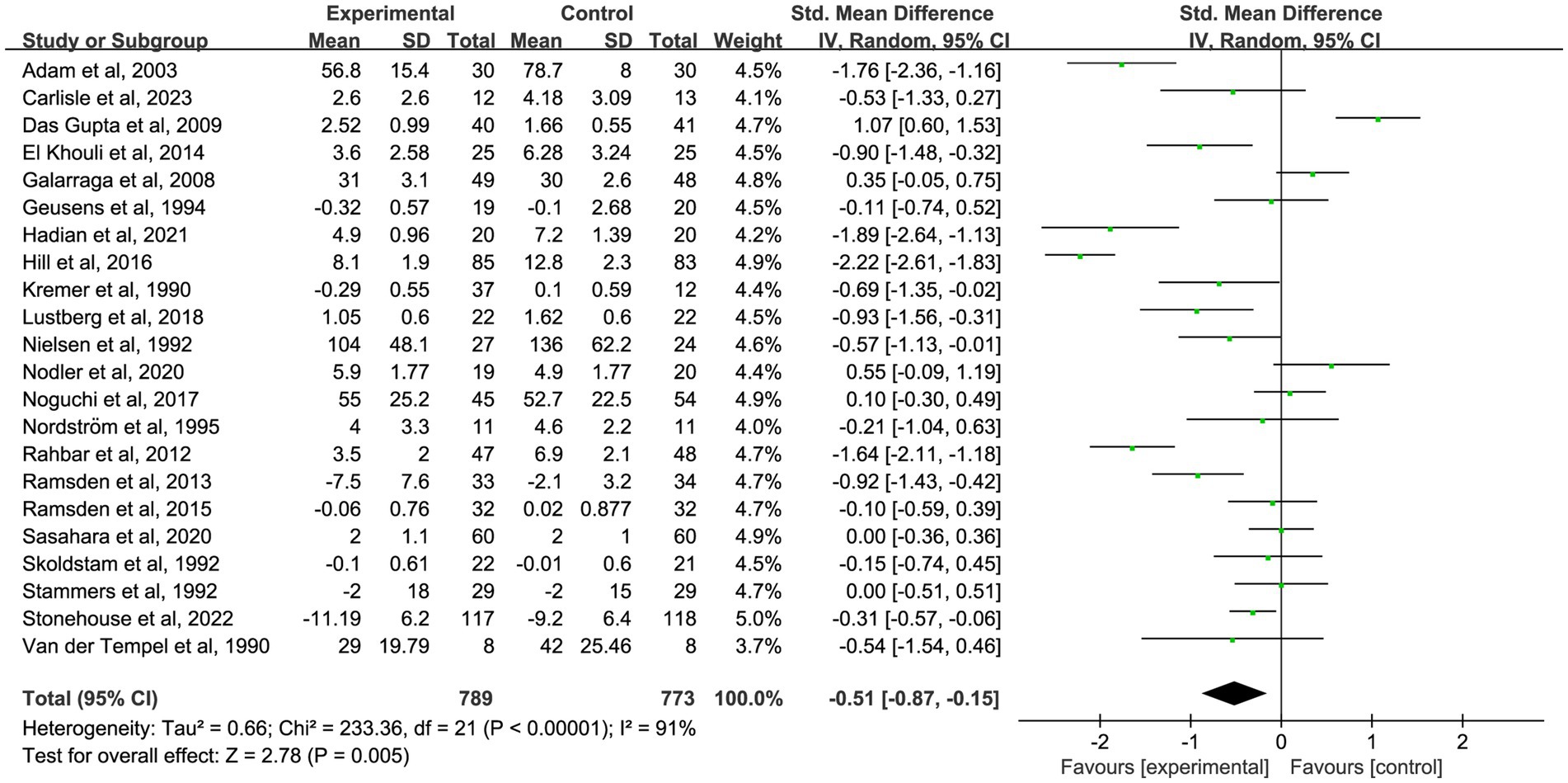 Forest plot showing standardized mean differences (SMD) between experimental and control groups across various studies. Each study’s SMD and 95% confidence interval (CI) are represented by horizontal lines and green dots. The pooled estimate at the bottom indicates an overall effect favoring the experimental group with an SMD of -0.51. Heterogeneity statistics show significant variance among studies.