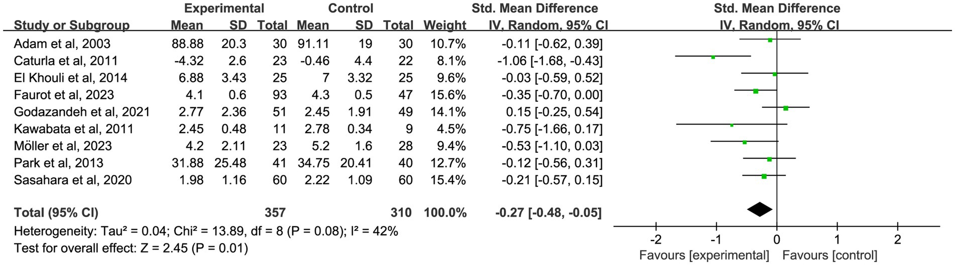 SMDs were selected because they allow aggregation of results derived from different assessment instruments across studies (e.g., various pain scales). SMDs were calculated by standardizing the mean difference between intervention and control groups using the pooled standard deviation. An SMD of zero indicates no difference between groups. In this analysis, a negative SMD favors the intervention (indicating pain reduction), whereas a positive SMD favors the control group. According to Cohen’s thresholds, an SMDs >0.8 reflects a large effect, >0.5 a moderate effect, and <0.2 a small effect (13).
