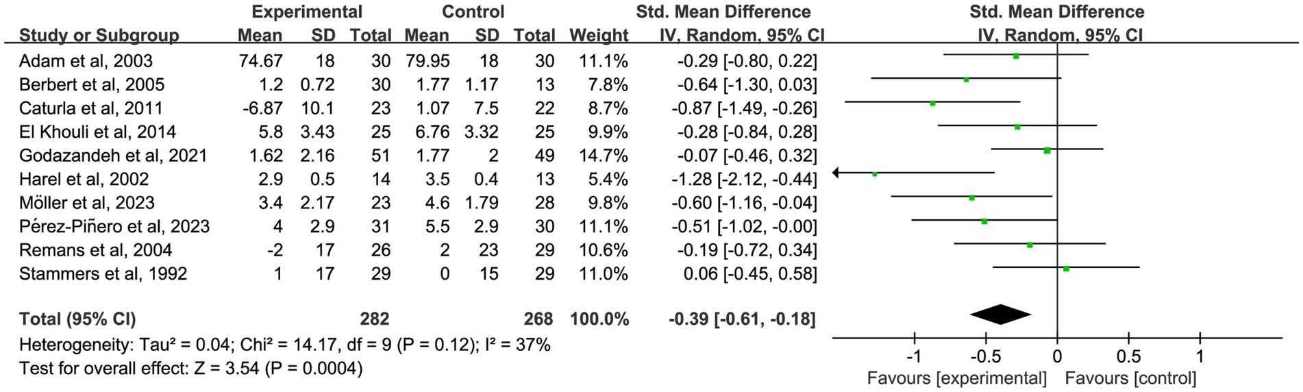 Forest plot showing a meta-analysis of ten studies comparing experimental and control groups. Each study is represented with a green square and a horizontal line indicating the standard mean difference and confidence interval. The overall effect is represented by a diamond at -0.39, favoring the experimental group. Heterogeneity is low with an I-squared of thirty-seven percent.