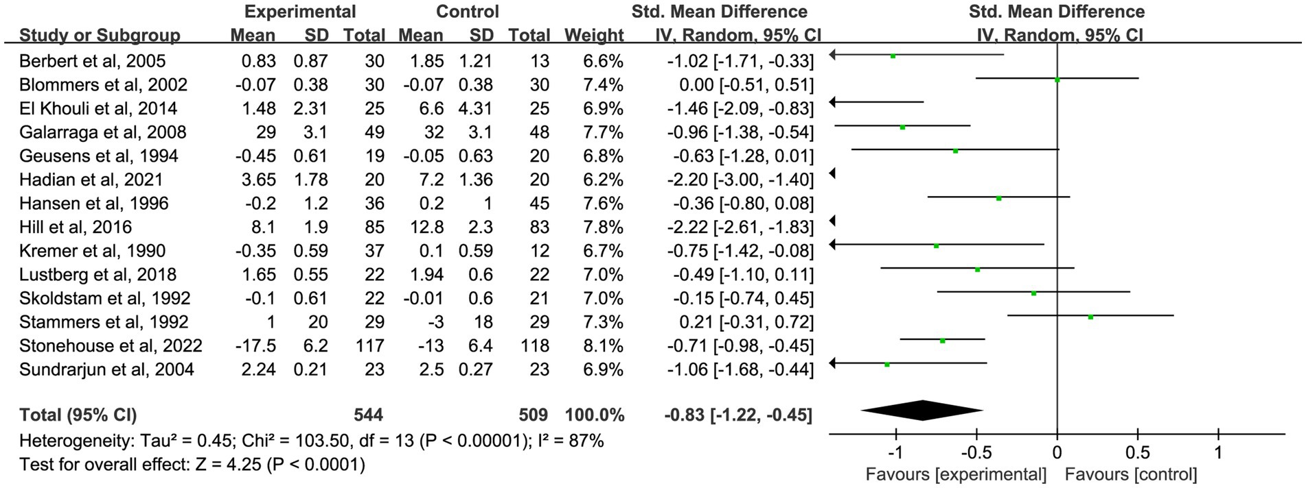 Forest plot displaying a meta-analysis of 13 studies, showing standardized mean differences with 95% confidence intervals. Individual studies are listed with corresponding statistical data, including mean, standard deviation, and sample size. The plot visualizes the overall effect size as a diamond shape, favoring the experimental group with an effect size of -0.83 and a confidence interval from -1.22 to -0.45. Heterogeneity is indicated by Tau-squared equal to 0.45 and I-squared equal to 87%.