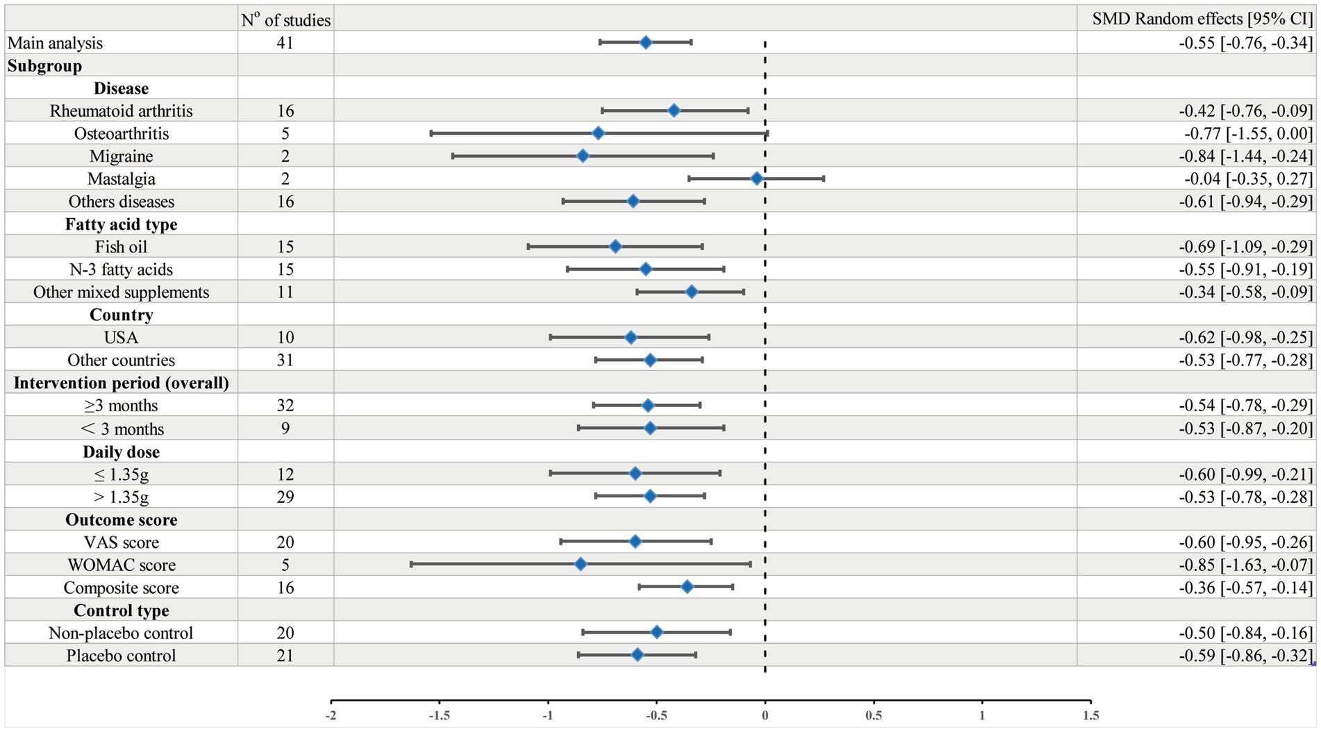 Forest plot showing the subgroup analysis of 41 studies assessing the effect size of interventions. Categories include disease type, fatty acid type, country, intervention period, daily dose, outcome score, and control type. The standardized mean difference (SMD) and 95% confidence intervals (CI) are presented for each category. Main analysis SMD is -0.55 [-0.76, -0.34]. Effects are more negative in osteoarthritis and migraine subgroups, with SMDs of -0.77 and -0.84, respectively. Positive effects are seen in placebo control with SMD of -0.59. The plot visually compares each subgroup’s SMD with a dashed line indicating no effect.