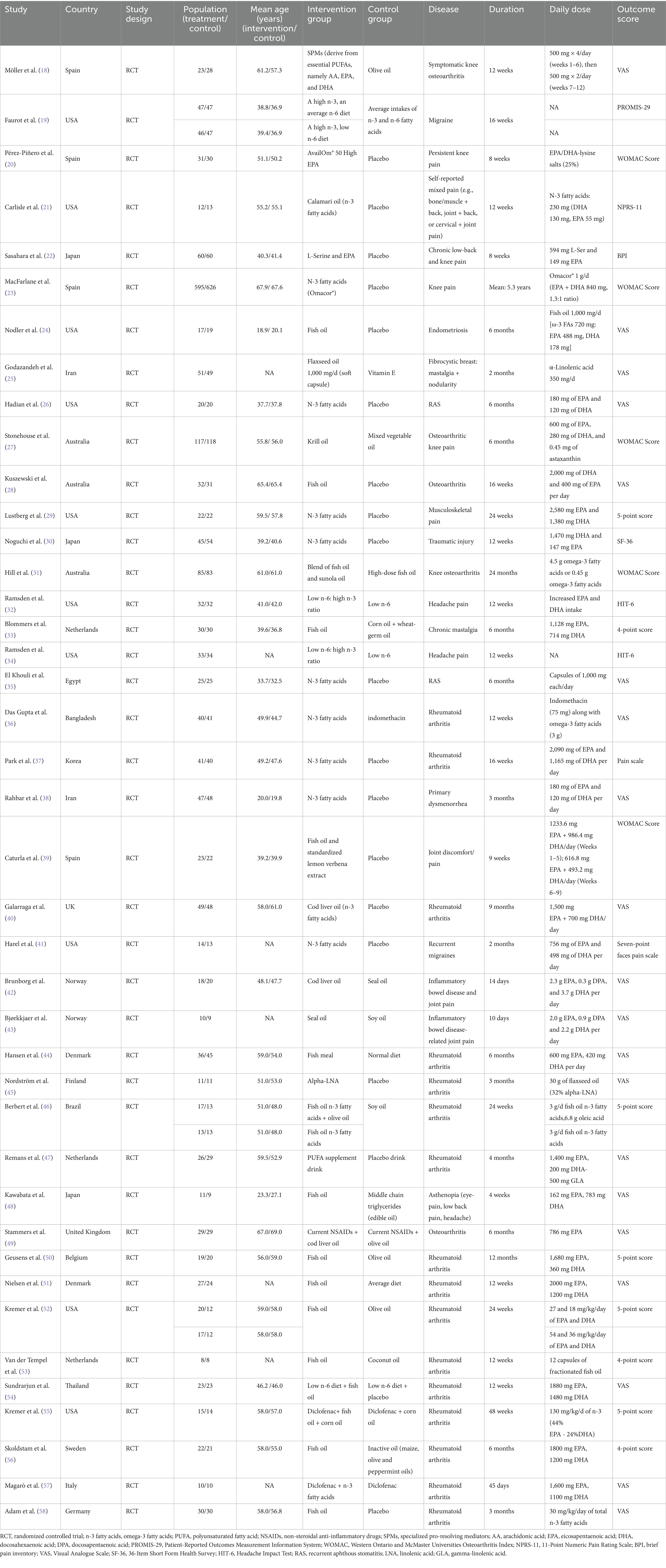The selection process, along with excluded records and reasons for exclusion, is outlined in Figure 1. The key characteristics of the included studies are presented in Table 1. Among the 99 full-text articles evaluated, 58 were excluded for various reasons, including 4 that were reviews or meta-analyses, 20 that were conference abstracts, 9 that did not involve patients with chronic pain, 7 that did not incorporate n-3 fatty acid intervention, 8 with non-RCT, and 10 that lacked relevant outcome measures. Therefore, 41 randomized controlled trials were retained for the final analysis (1858).