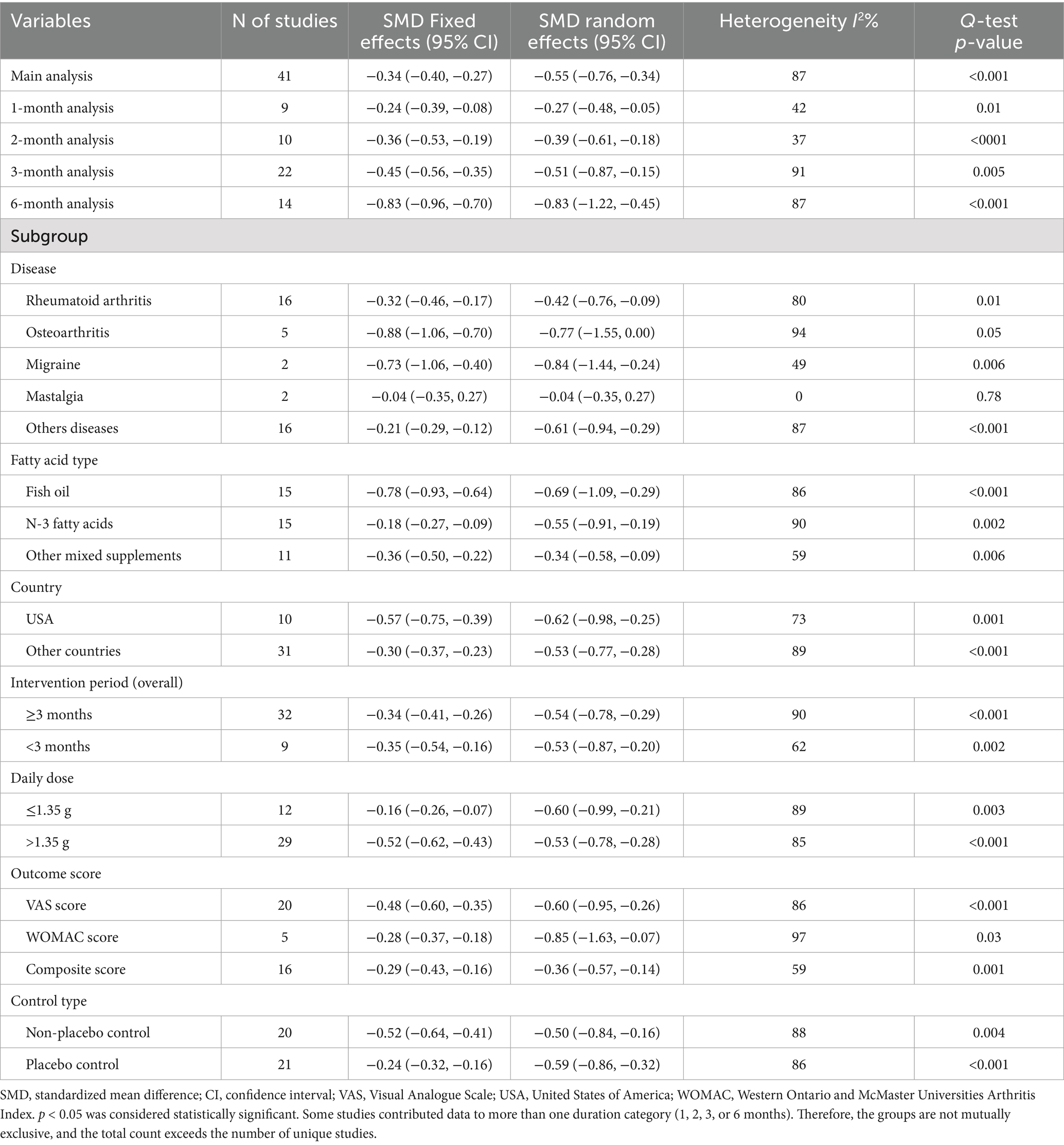 Subgroup analysis based on intervention duration revealed that both short-term (<3 months) and long-term (≥3 months) supplementation with omega-3 fatty acids led to significant reductions in pain. Short-term interventions (nine studies) (20, 22, 3943, 48, 57) demonstrated a statistically significant effect (n = 450, SMD = −0.53, 95% CI: −0.87 to −0.20, p = 0.002; I2 = 62%), albeit smaller than long-term interventions (32 studies) (18, 19, 21, 2338, 4447, 4956, 58) which showed a stronger analgesic effect (n = 3,309, SMD = −0.54, 95% CI: −0.78 to −0.29, p < 0.001; I2 = 90%). as shown in Supplementary material and Table 2.