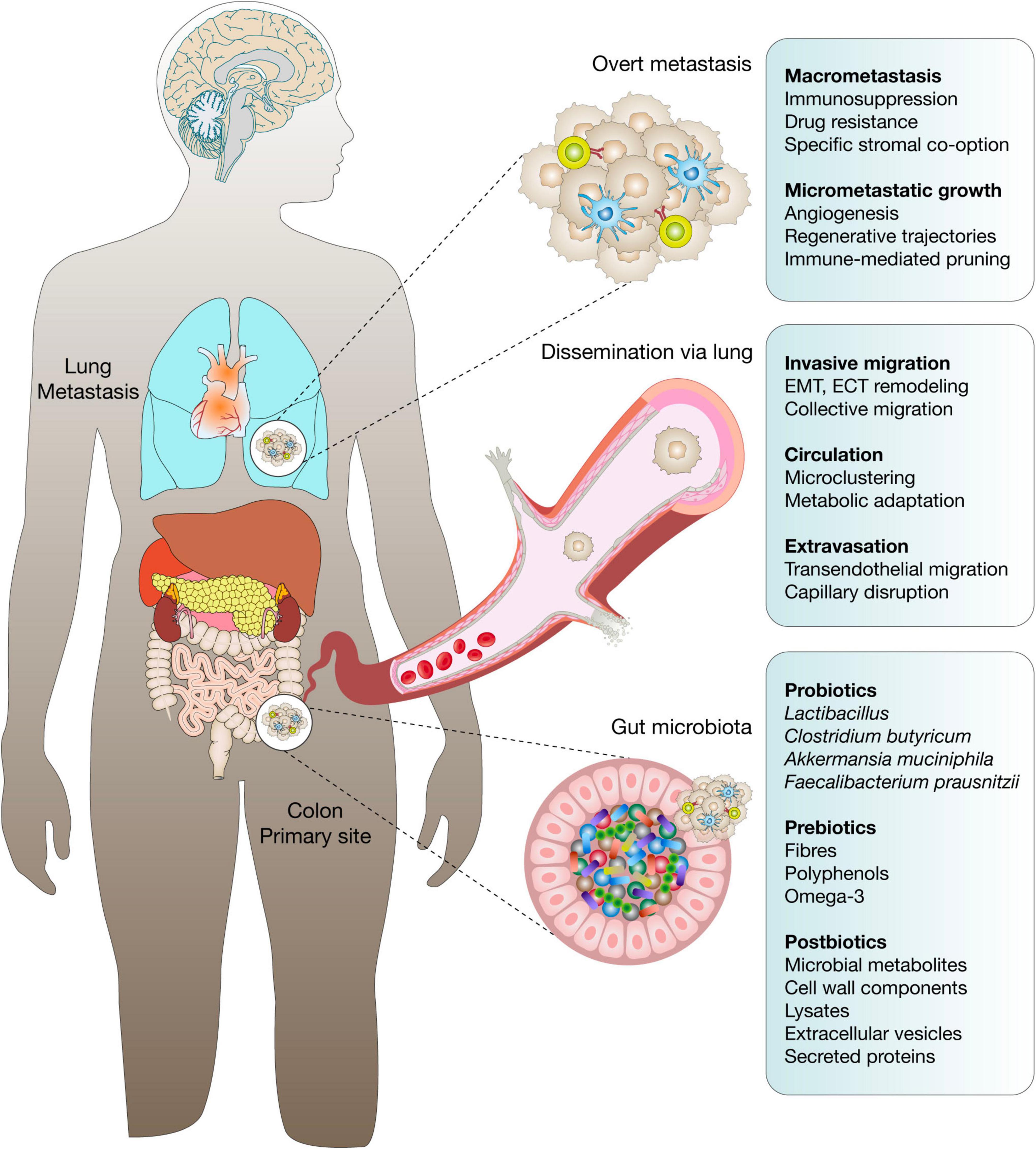 Figure 1. Microbial signatures in metastatic cancer progression. This schematic illustrates the dynamic influence of the microbiome and its derivatives, probiotics, prebiotics, and postbiotics, across distinct phases of metastasis originating from a primary colorectal tumor. In the healthy gut, beneficial microbial taxa, including Lactobacillus, Clostridium butyricum, Akkermansia muciniphila, and Faecalibacterium prausnitzii, are supported by prebiotic substrates such as dietary fibers, polyphenols, and omega-3 fatty acids. These communities generate postbiotics, including microbial metabolites, cell wall components, lysates, extracellular vesicles, and secreted proteins, that modulate host immunity, barrier integrity, and metabolic tone. Upon oncogenic transformation, microbial dysbiosis may contribute to metastatic initiation. At the primary site, tumor cells undergo epithelial–mesenchymal transition (EMT), extracellular matrix remodeling, and collective migration to invade surrounding tissue. Dissemination occurs via hematogenous spread, with tumor cells forming microclusters and undergoing metabolic adaptation in circulation. In the lungs, micrometastatic niches are characterized by angiogenesis, regenerative-like transcriptional trajectories, and immune-mediated pruning. Progression to overt macrometastases involves stromal co-option, immune suppression, and therapy resistance. The figure integrates microbiome-derived factors that influence each metastatic stage, emphasizing the therapeutic potential of microbiome modulation to disrupt metastatic cascades and restore immune competence.