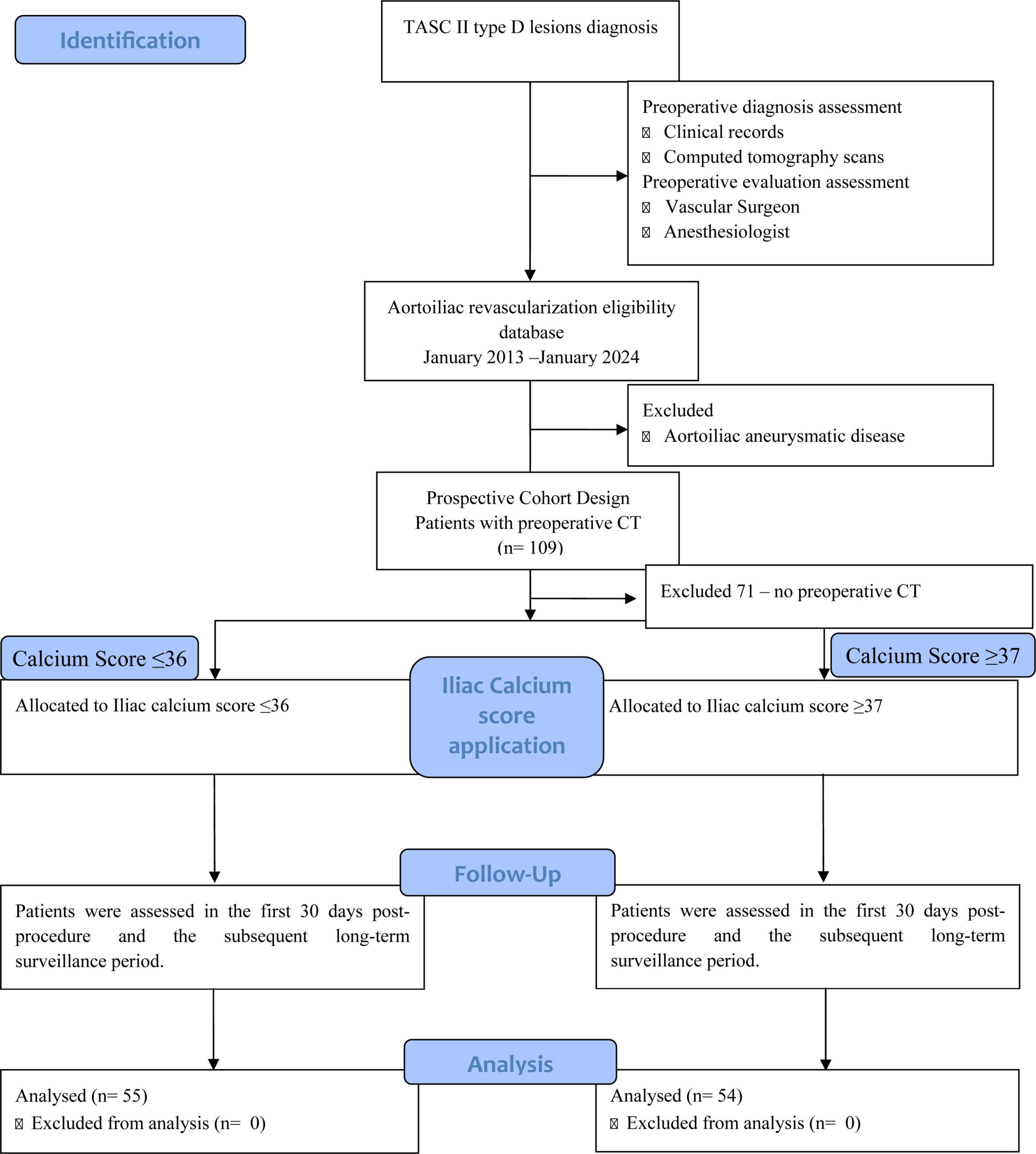 A total of 180 consecutive patients who underwent elective aortoiliac revascularization between January 2013 and January 2024 were included in a prospective cohort. All patients were selected from a tertiary and a community hospital and had aortoiliac TASC II type D lesions, excluding those with aortoiliac aneurysmatic disease (18). The choice between open surgery and an endovascular procedure was made by a shared decision between the patient and the surgeon, considering the surgeon and the institution’s experience and preferences.